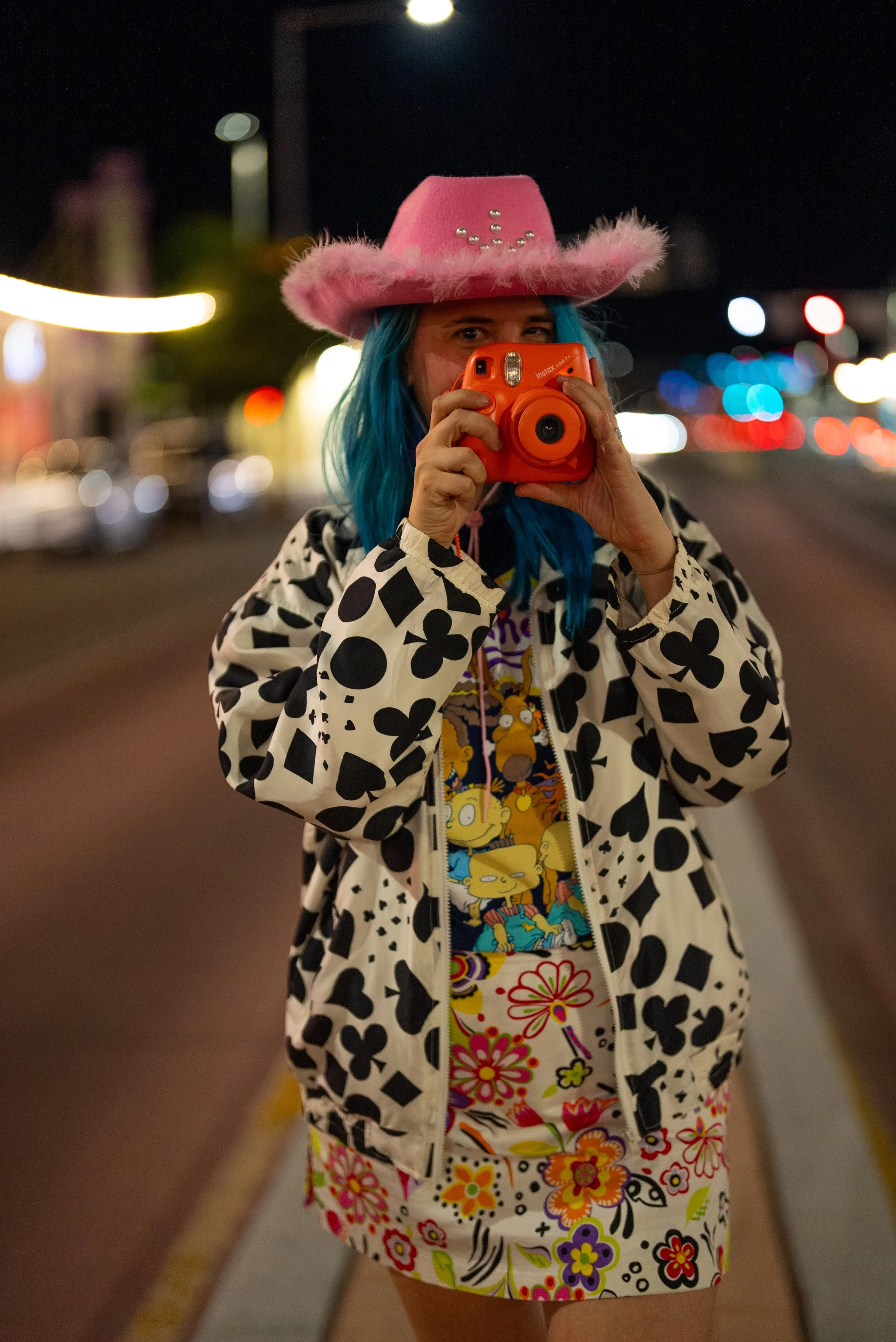 A person with bright blue hair wearing a pink cowboy hat with pearl accents, a black and white polka dot jacket, and a colorful floral skirt, is standing on a city street at night, taking a photo with an orange instant camera.
