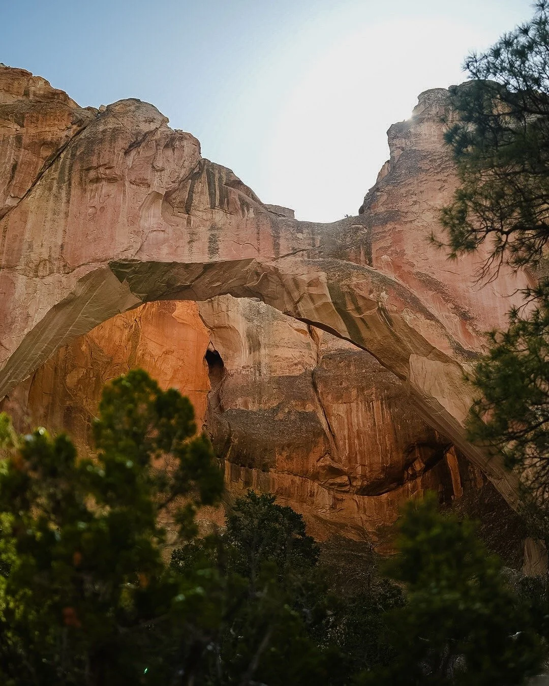 A large red rock formation with a natural arch, surrounded by green trees under a bright sky.
