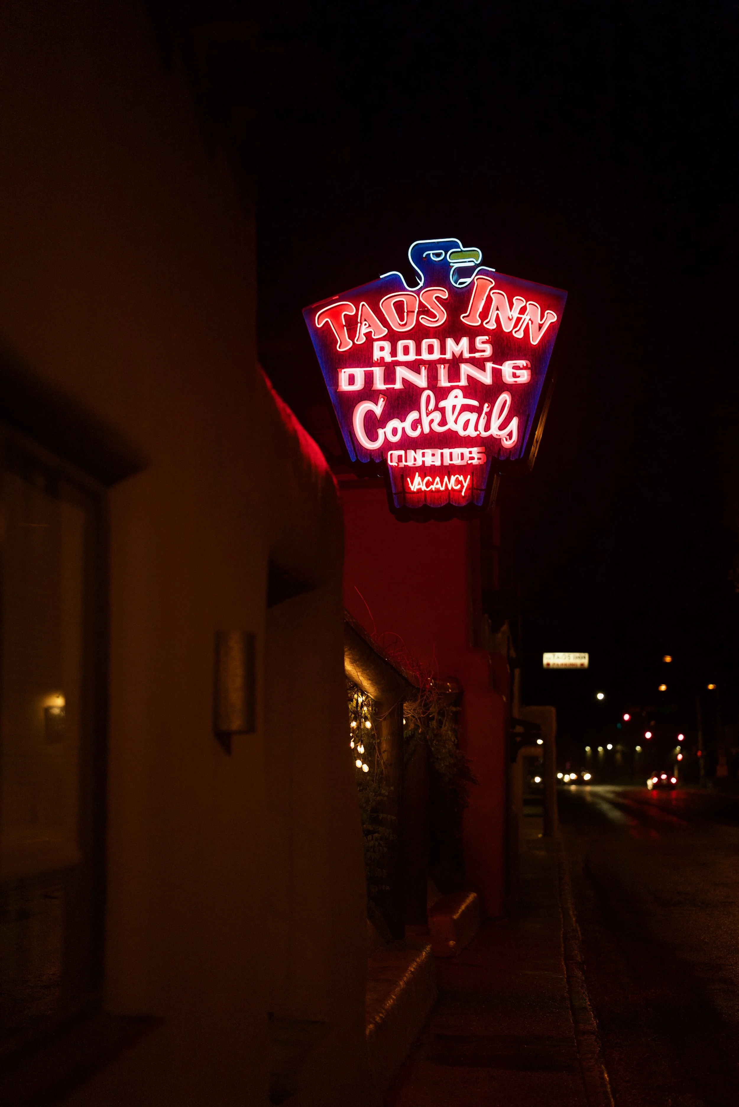 Neon sign reading 'Tao's Inn Rooms, Dining, Cocktails, Quaint, Vacancy' illuminated at night outside a building