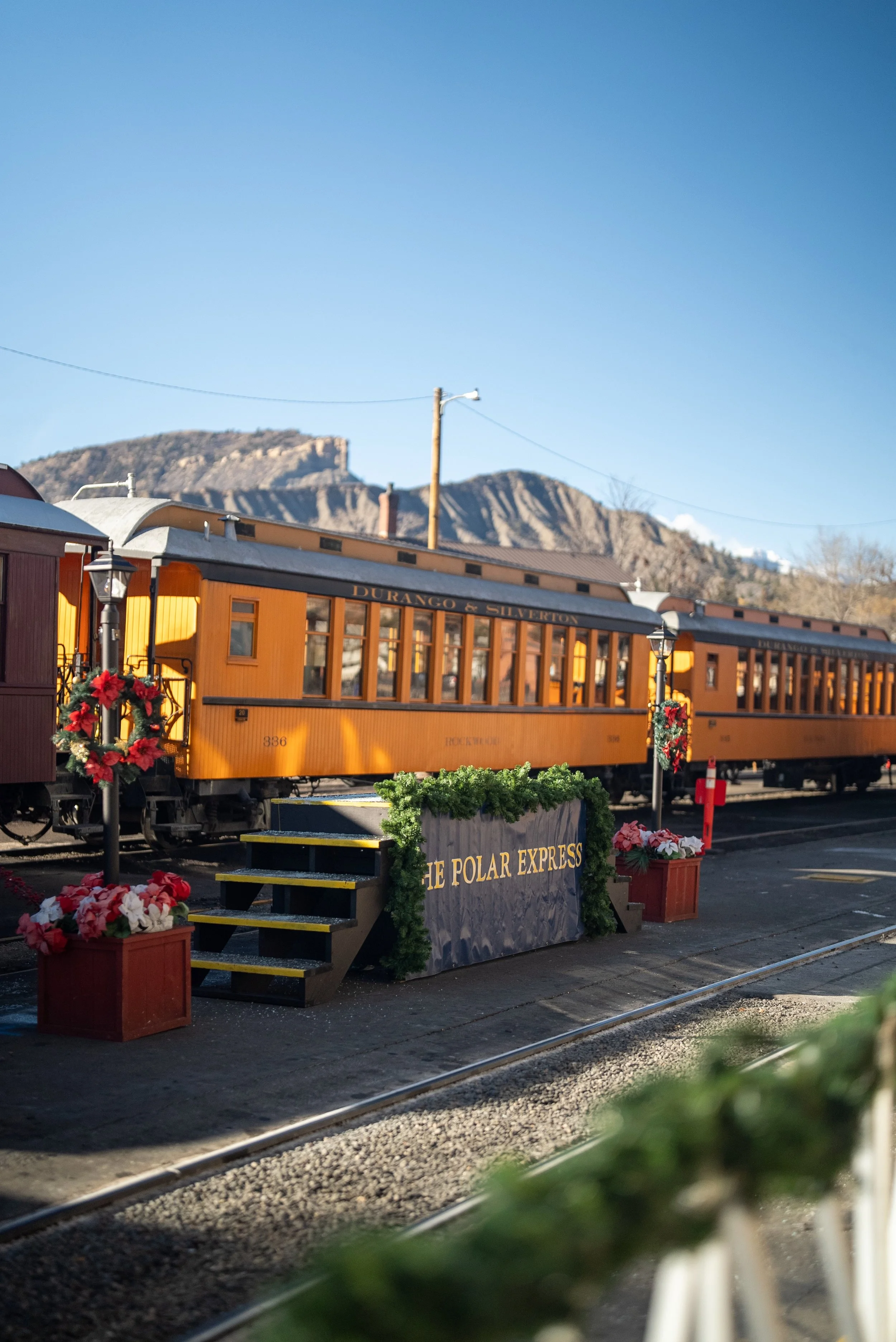 A small train decorated with Christmas wreaths and flowers, labeled 'The Polar Express,' parked on a track with mountainous terrain in the background.