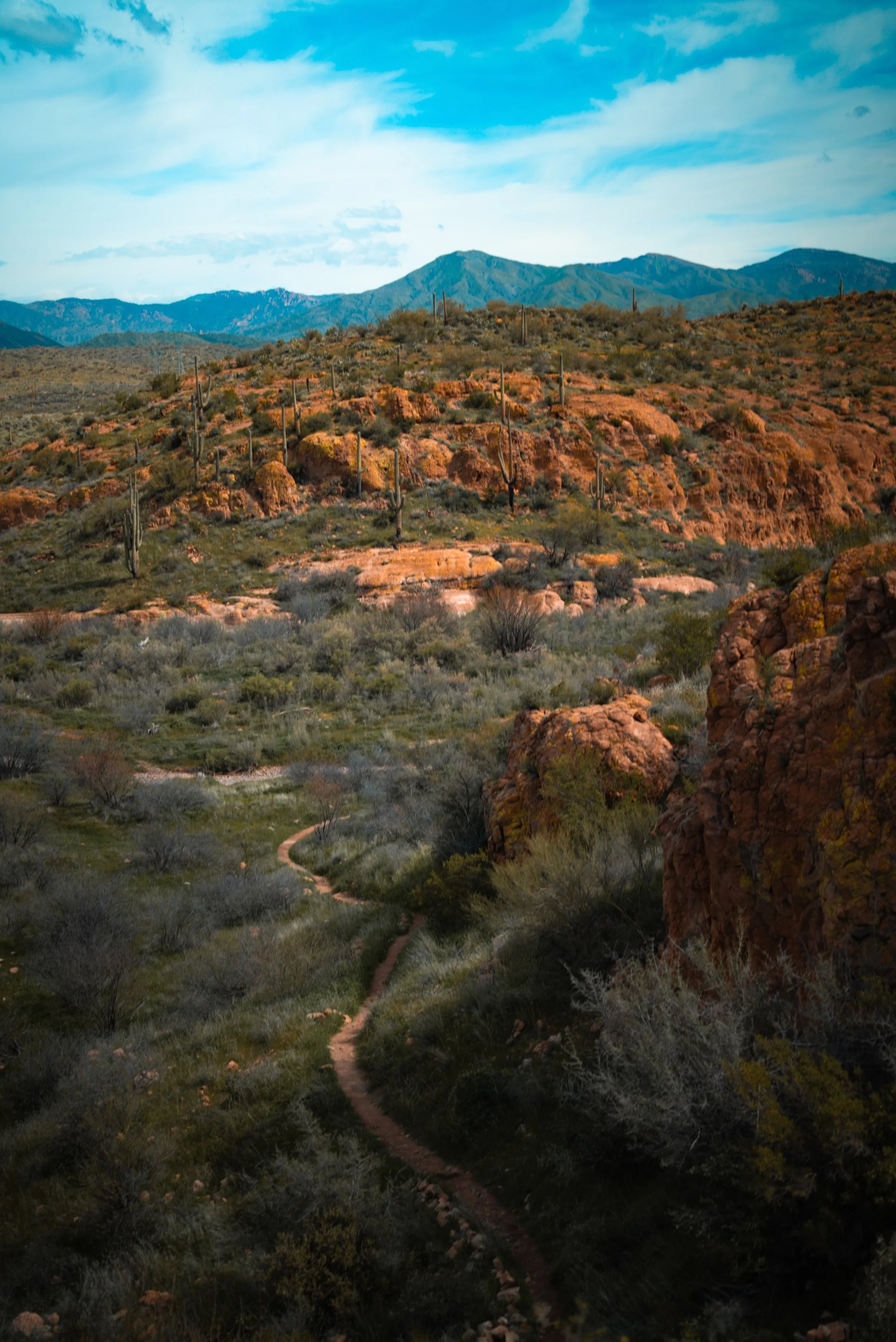 A desert landscape with a narrow dirt trail winding through shrubs and rocks, cacti on the hills, and mountains in the distance under a partly cloudy sky.