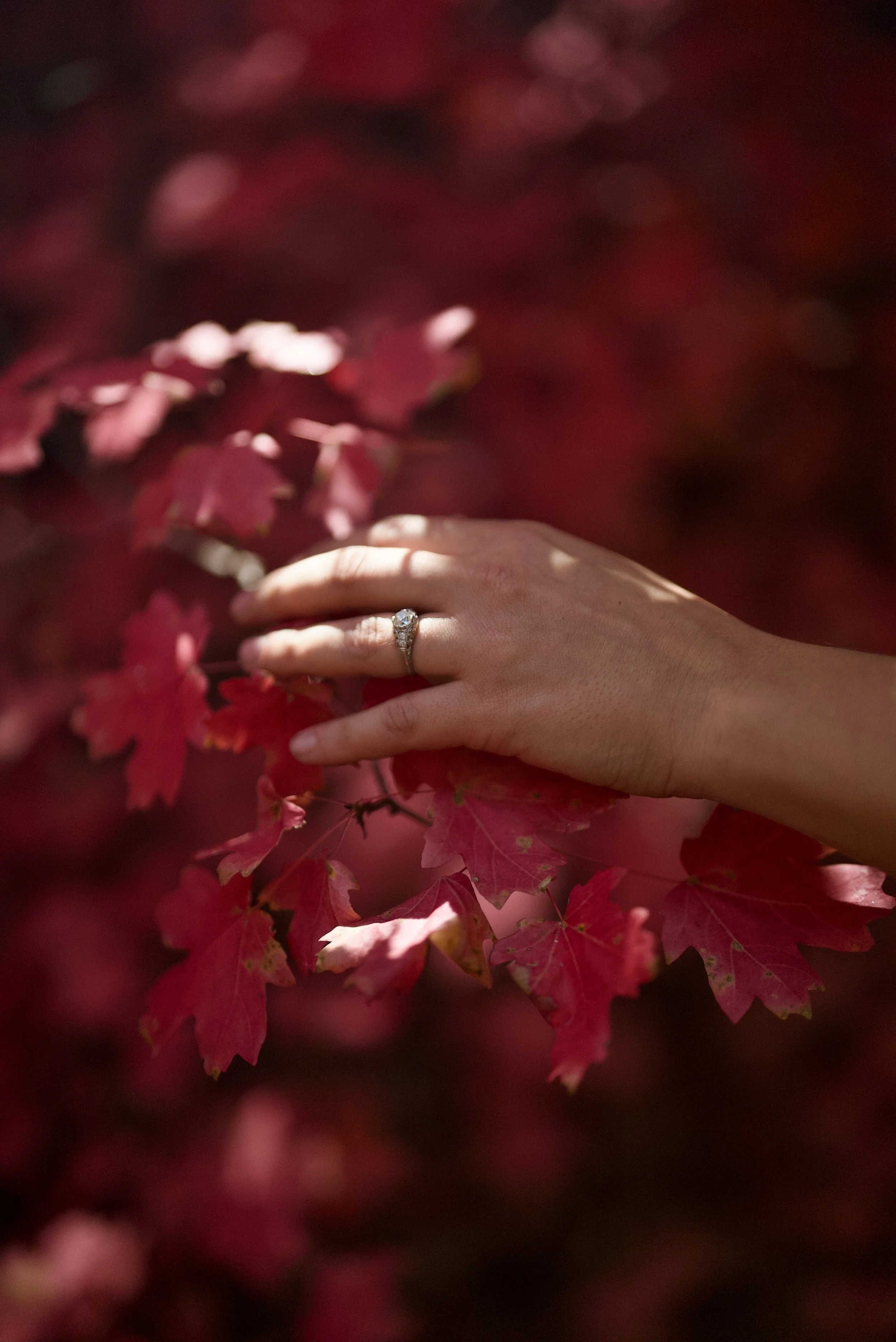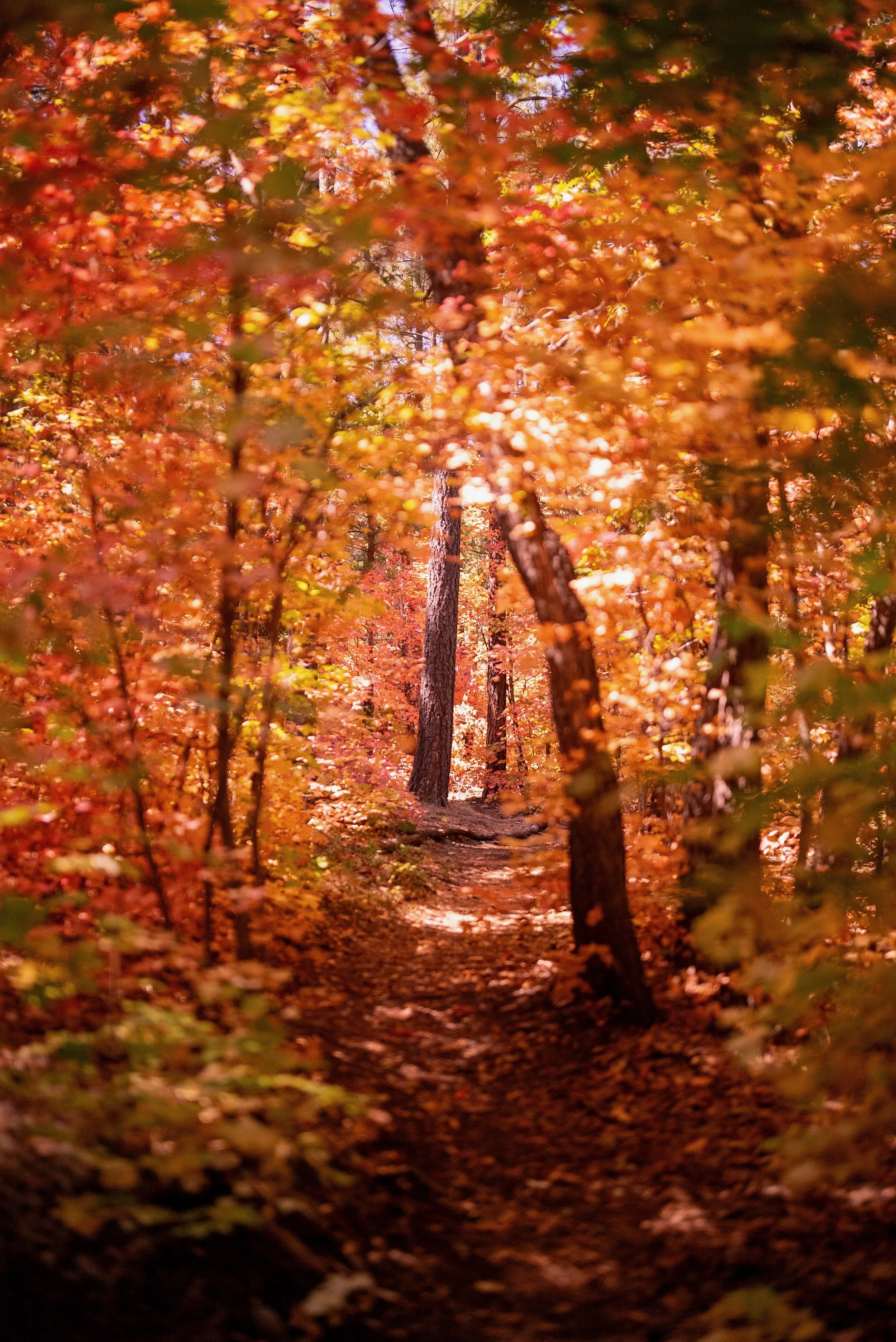 A forest trail surrounded by fall foliage with orange, yellow, and red leaves.
