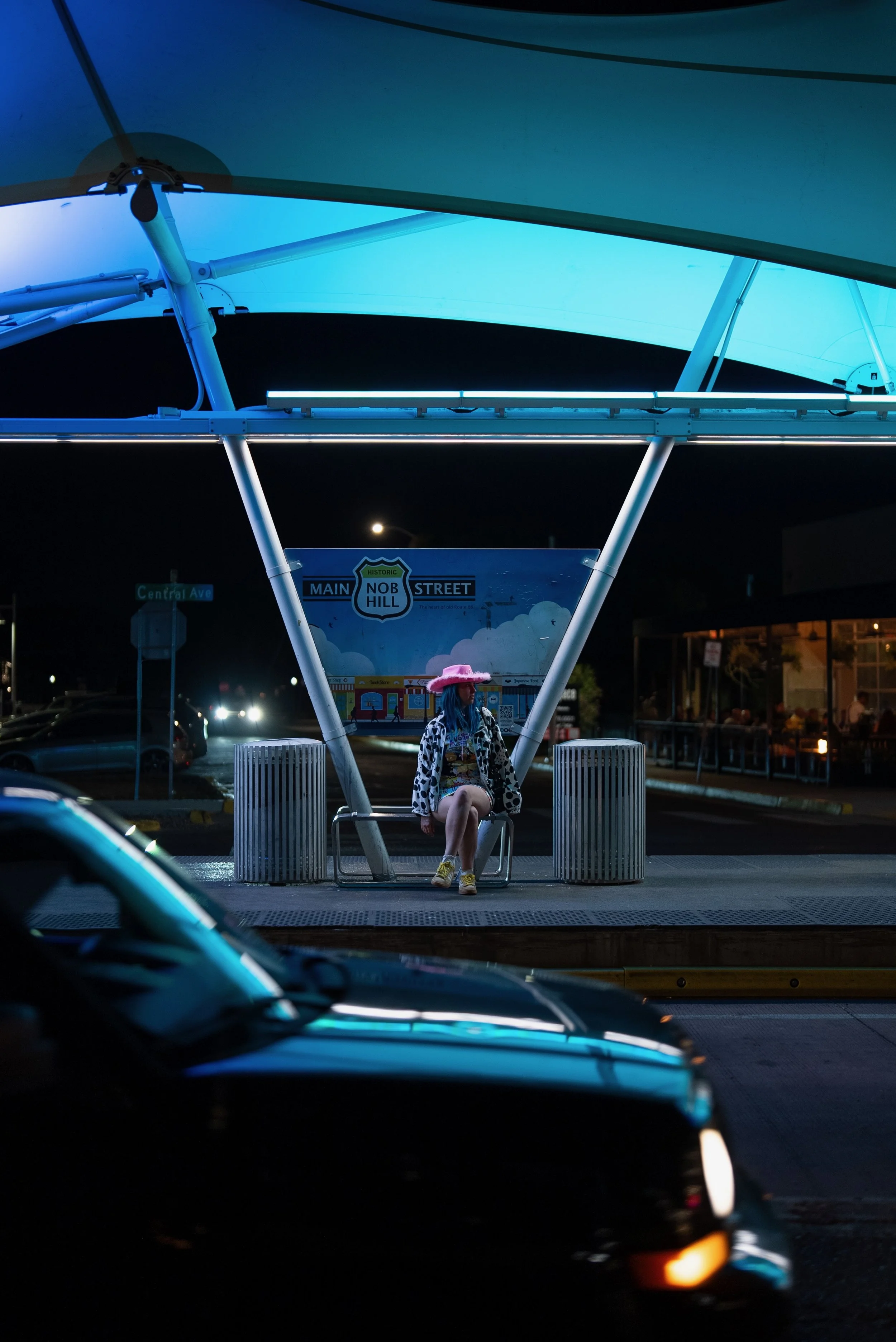 A woman with blue hair sitting on a bench at night under a modern, illuminated bus stop shelter with a pink wide-brimmed hat, patterned jacket, and yellow shoes, in Nob Hill area with street signs and cars nearby.