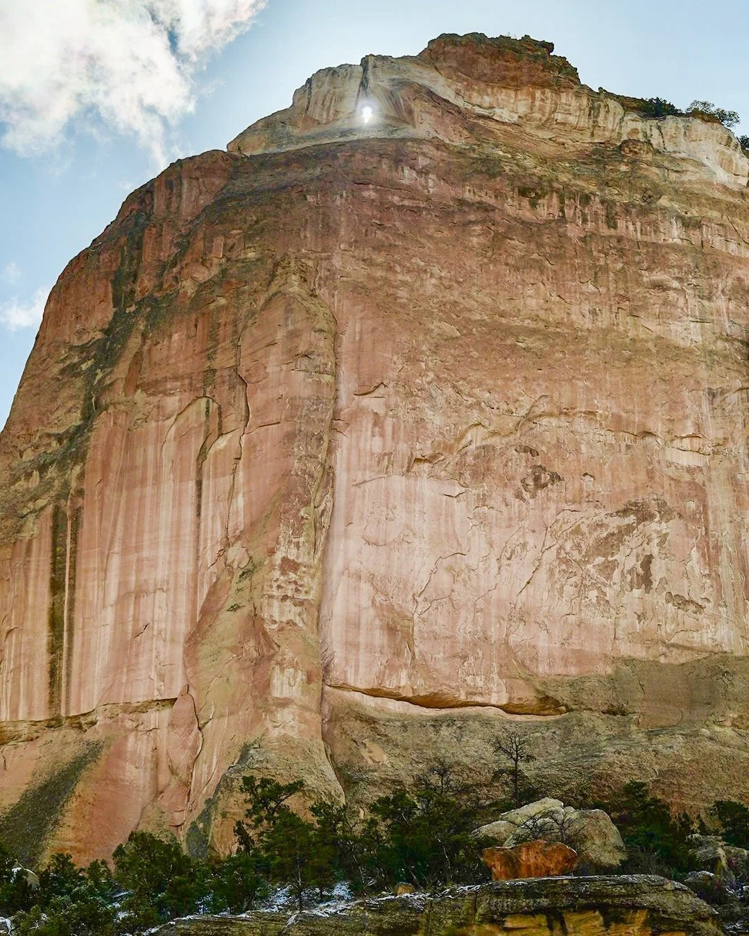 Large, reddish-brown mountain with vertical striations and moss at base, blue sky with partial clouds, sun peeking from behind the top of the mountain.