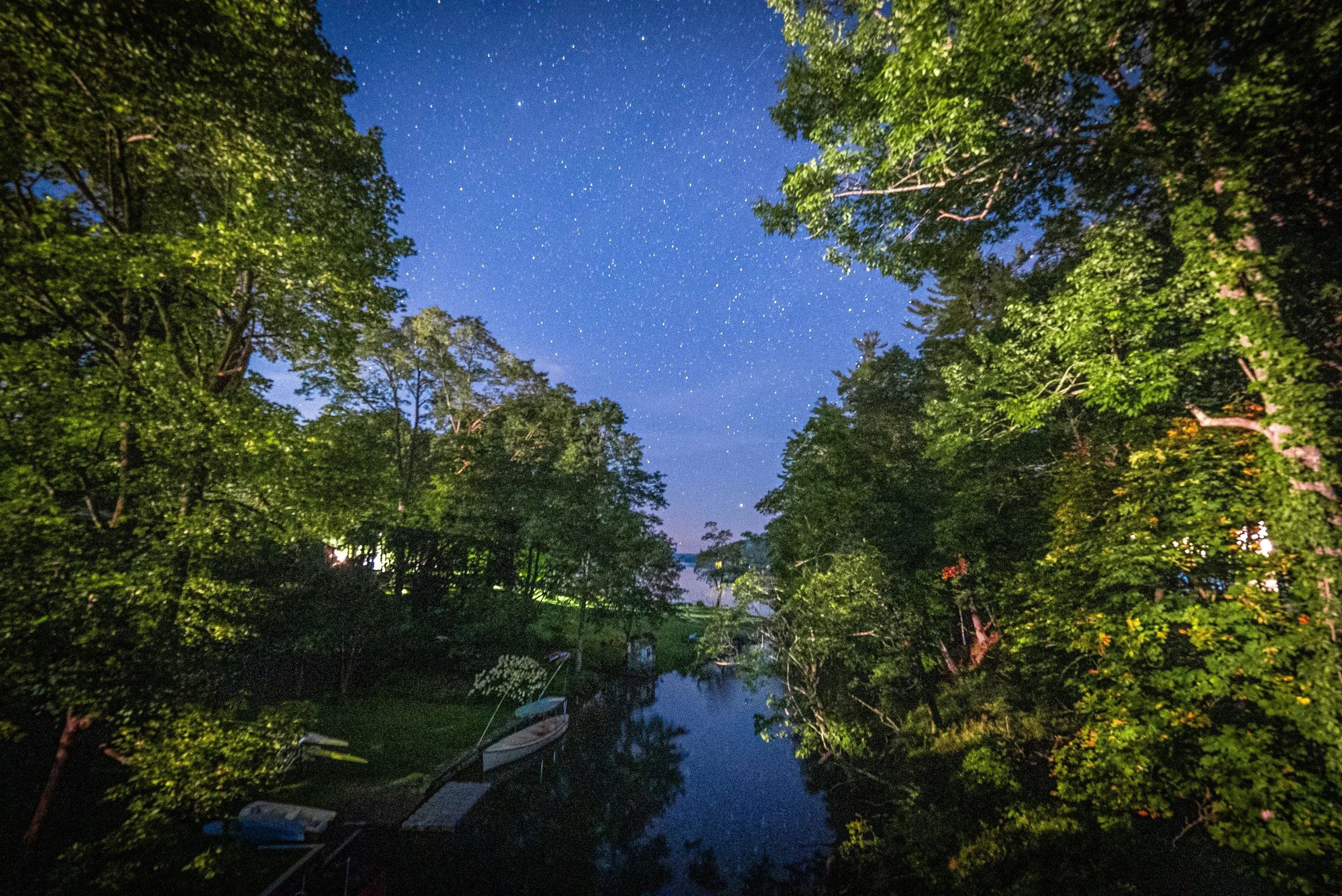Nighttime scene of a river surrounded by trees, with a starry sky overhead