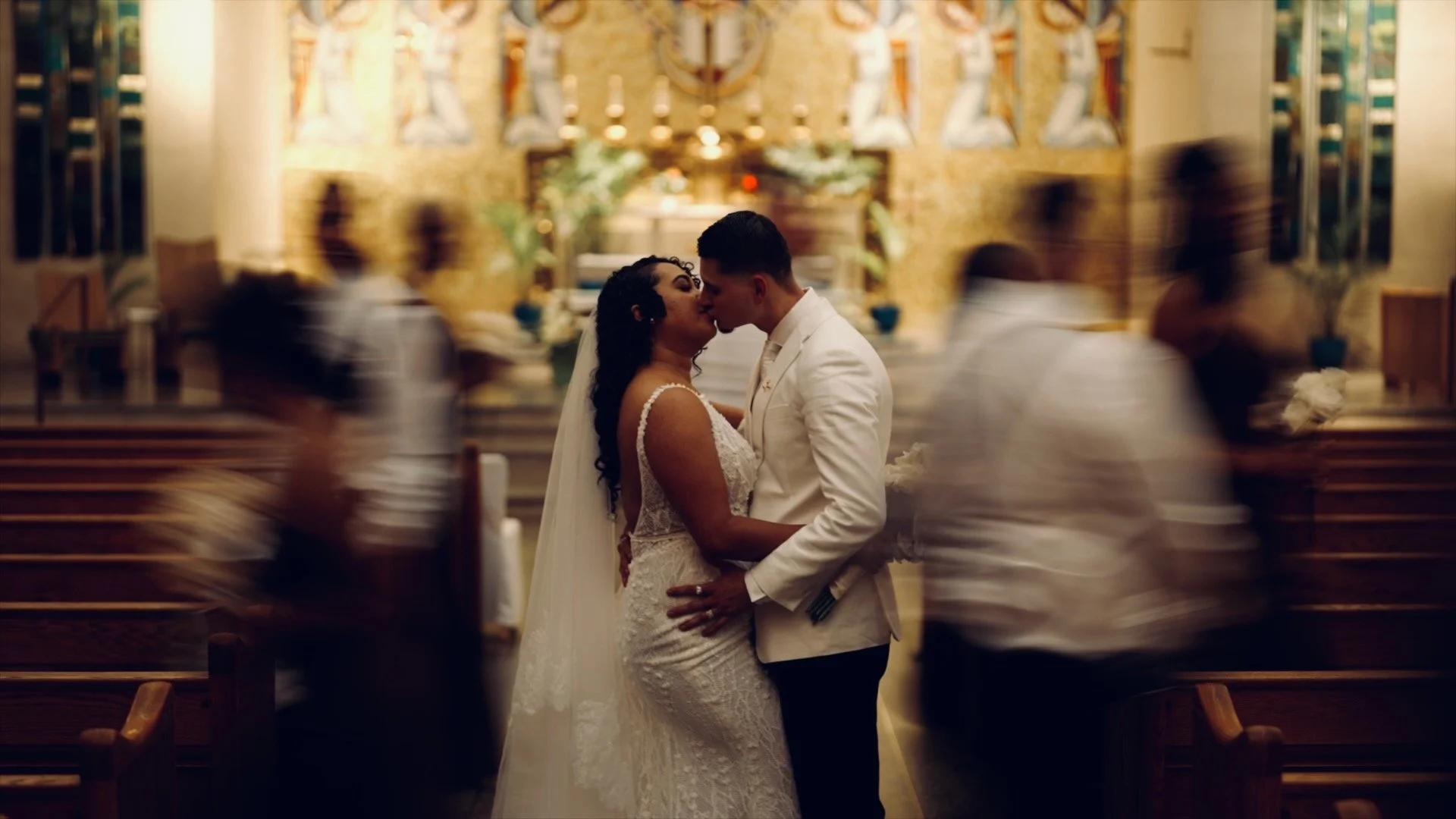 A bride and groom kiss at the altar in a church, surrounded by blurred guests.