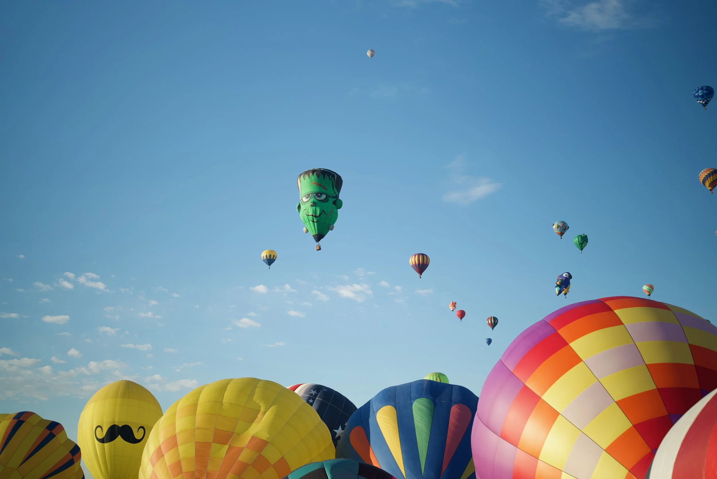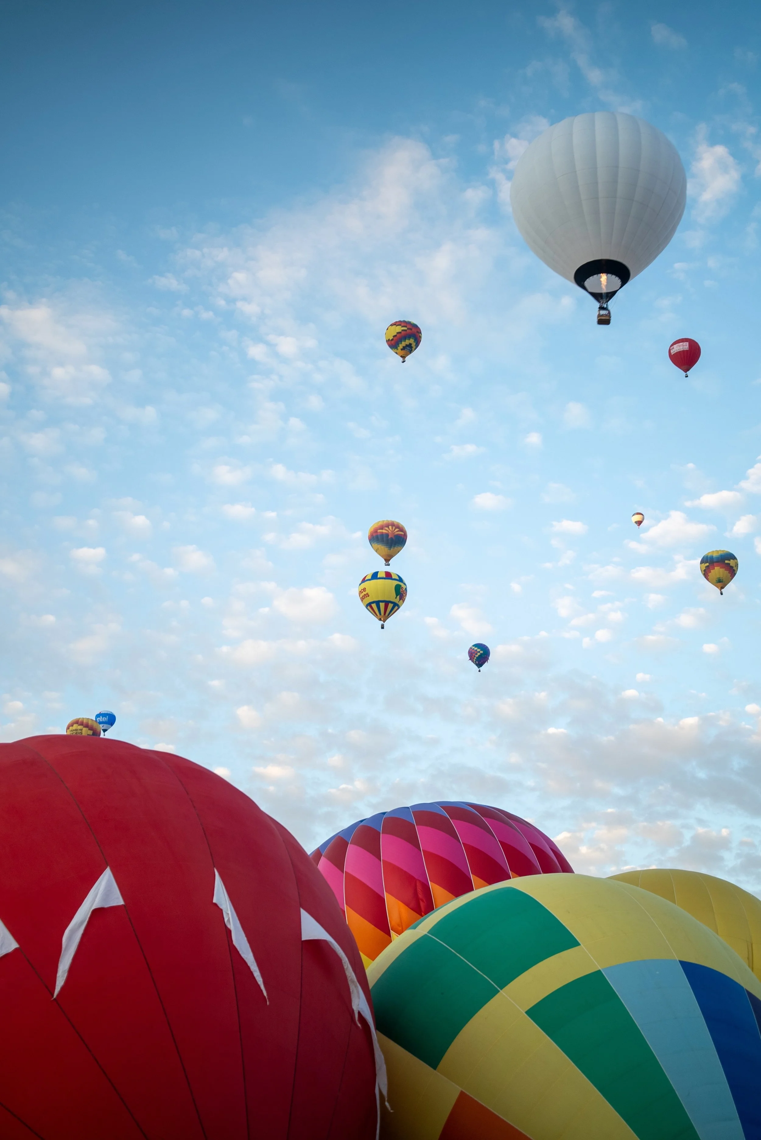 Numerous colorful hot air balloons floating in the sky during the day, with a clear blue sky and a few scattered clouds.
