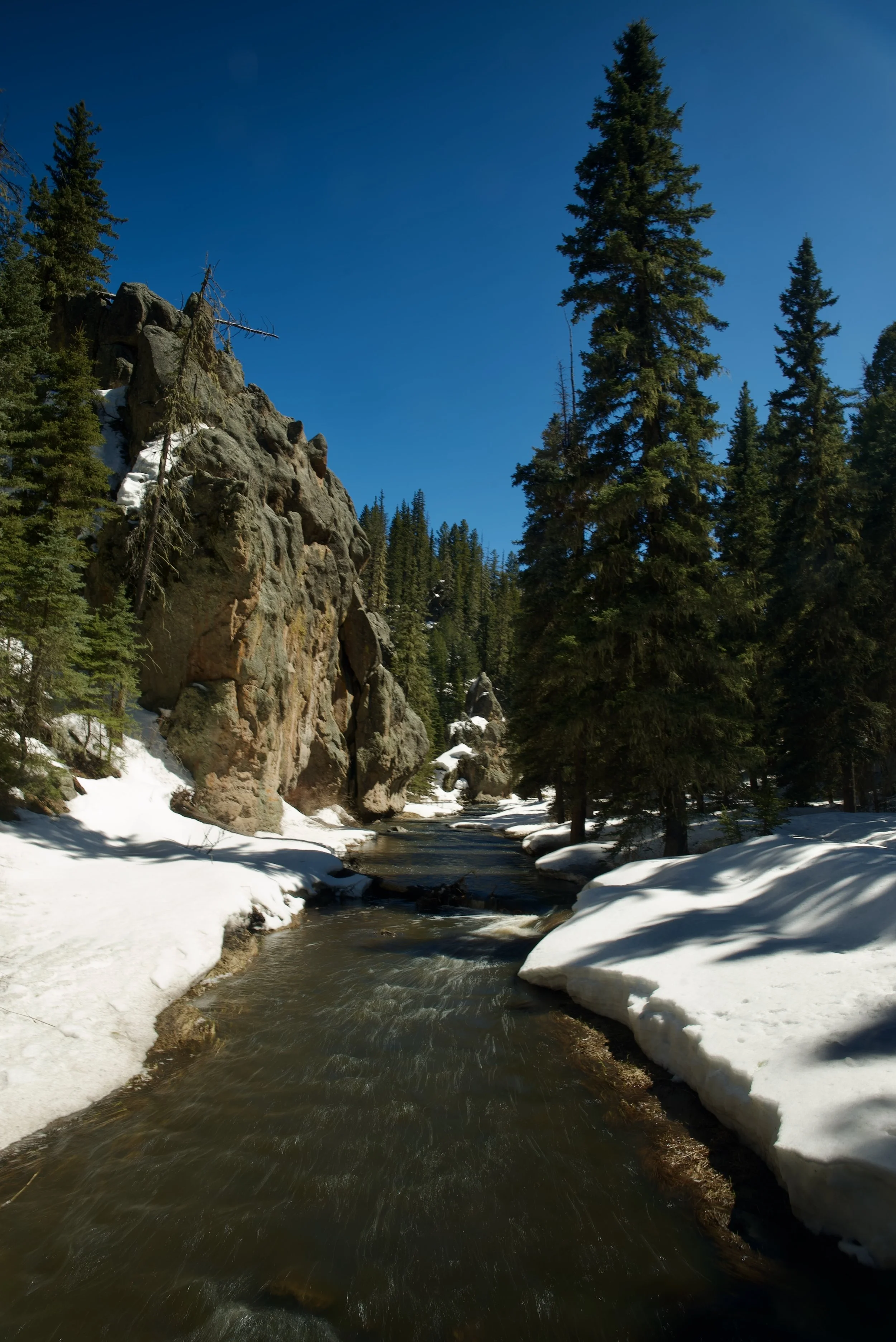 A mountain stream flowing through a snow-covered forest with tall pine trees and large rocks under a clear blue sky.