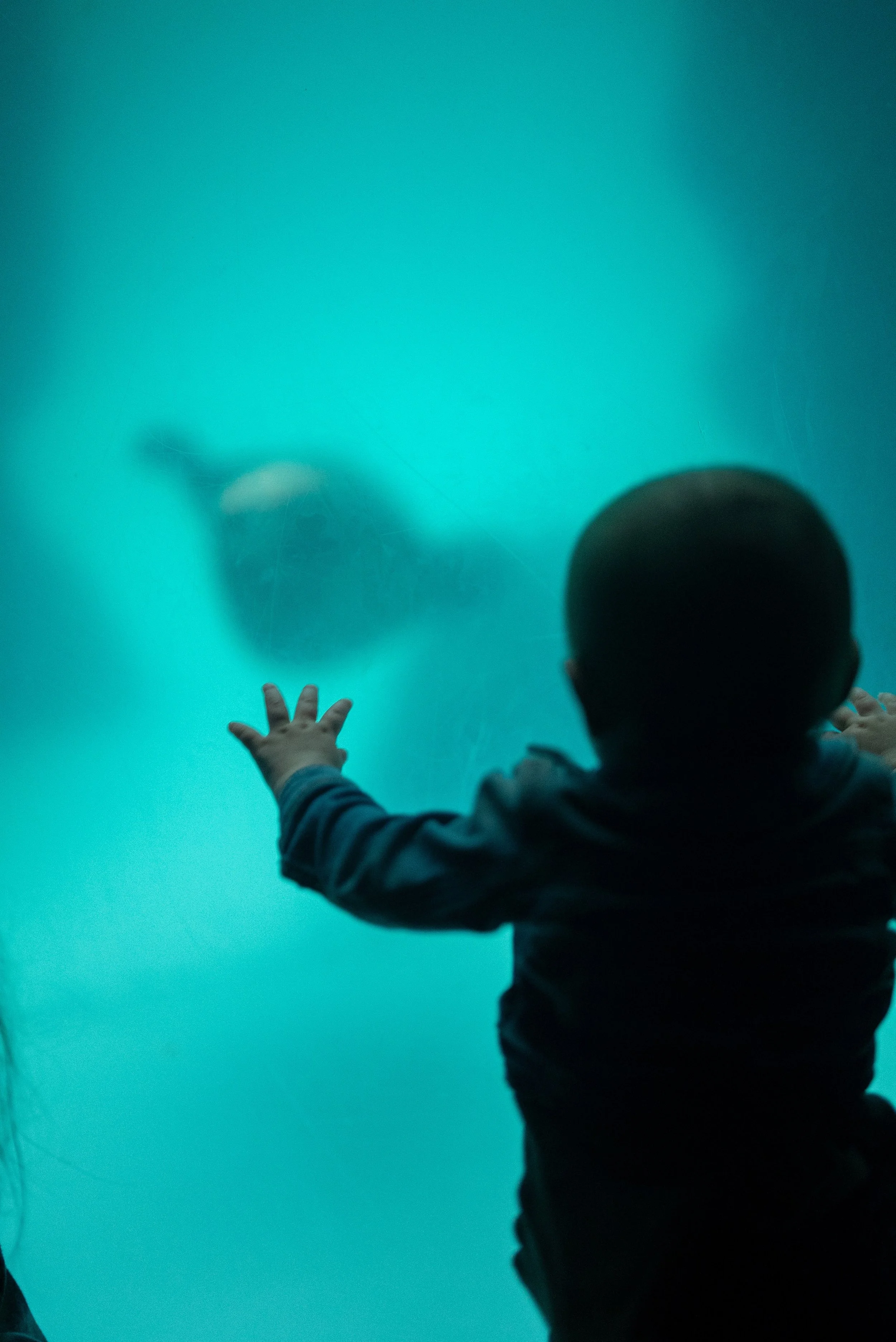 Child reaching out towards a whale in an aquarium, with blue water background.