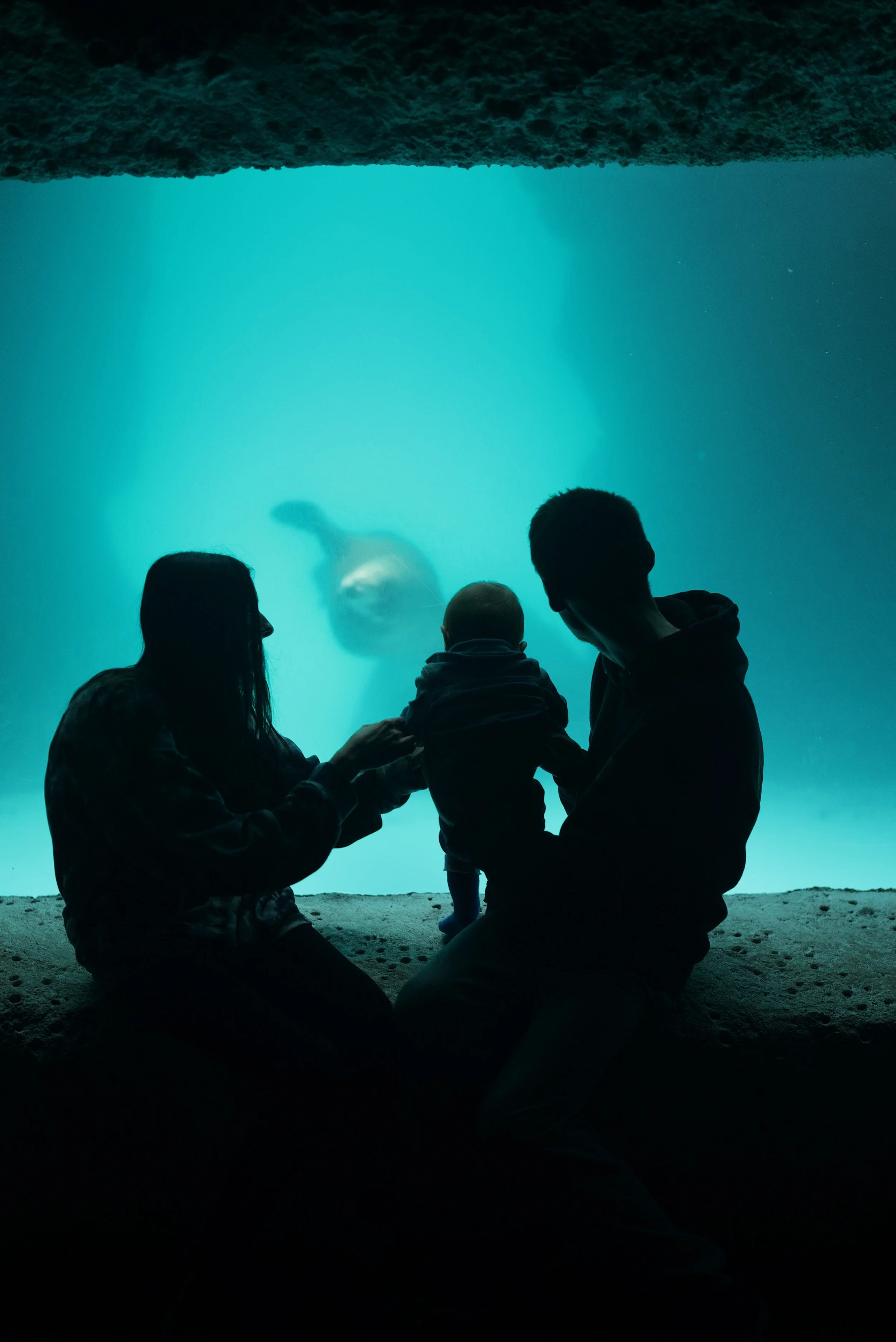 Silhouettes of a family, including a woman, a man, and a child, sitting together and observing a whale swimming underwater through a glass tunnel in an aquarium.