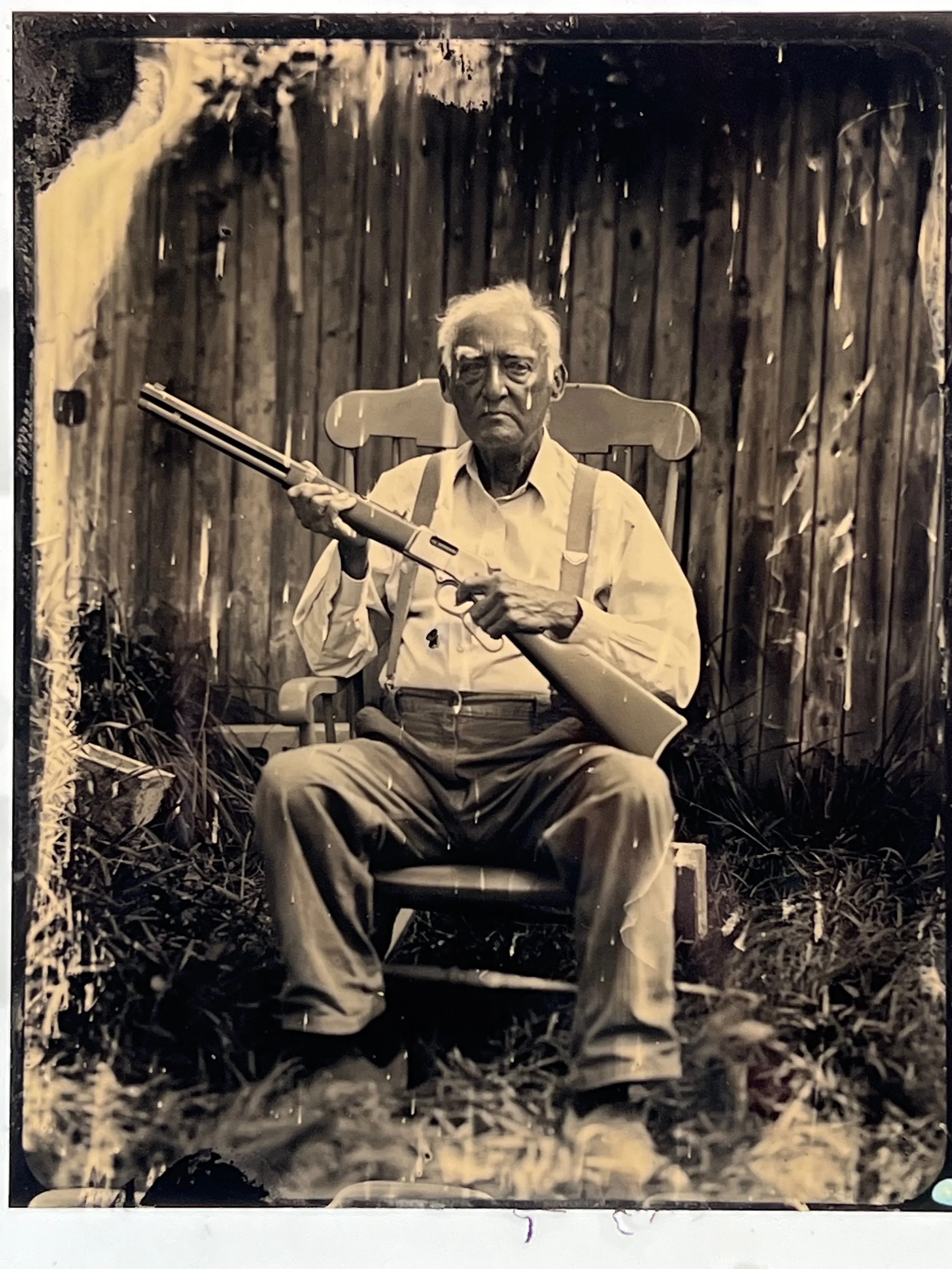 An elderly man with white hair sitting in a wooden rocking chair outdoors, holding a rifle with a serious expression, in front of a wooden fence.  Its a tin type photo.