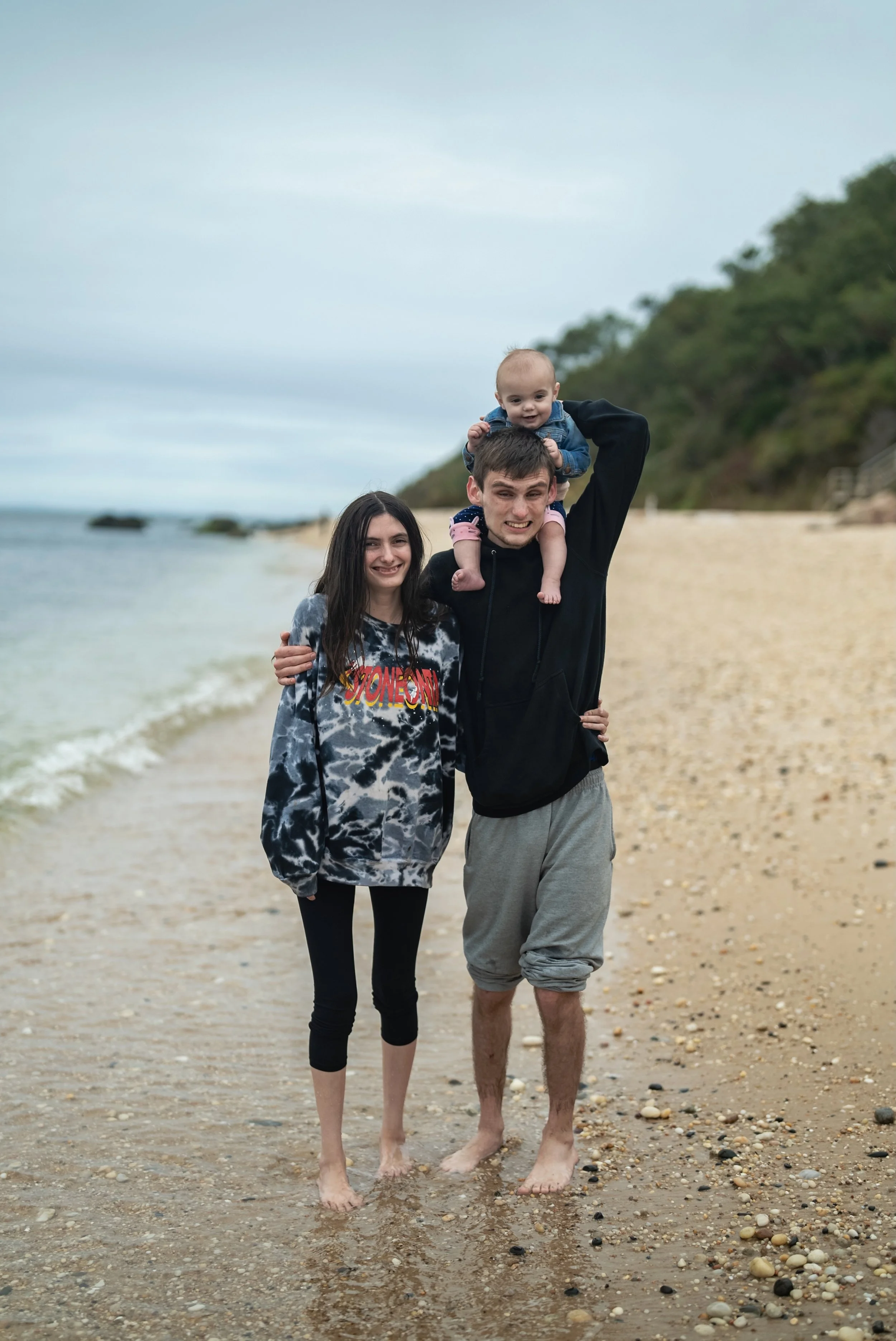 A family of three enjoying time at the beach, with a woman, man, and baby standing on the sandy shore near the water.
