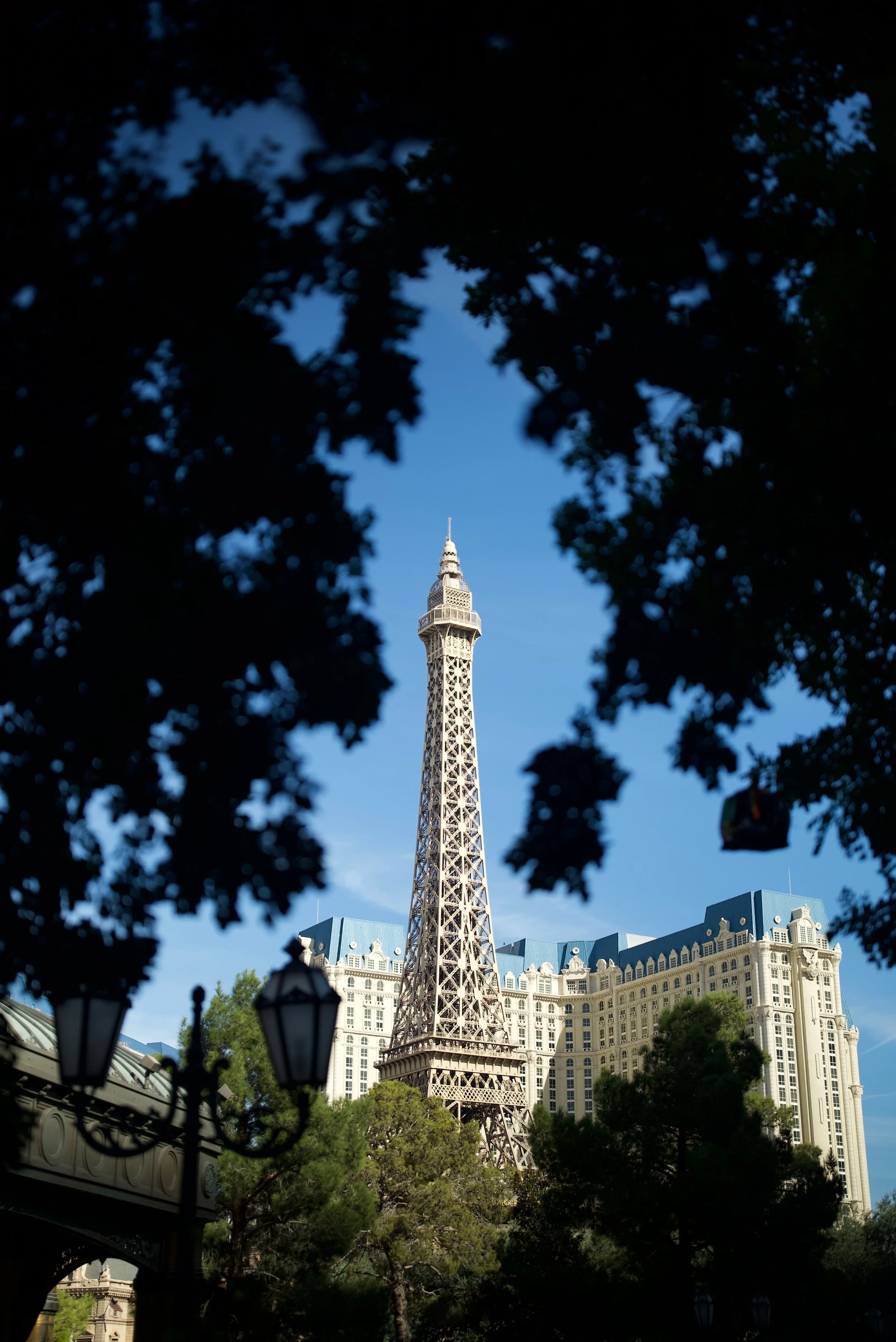 Replica of the Eiffel Tower in front of a large hotel building, framed by trees and dark leaves.