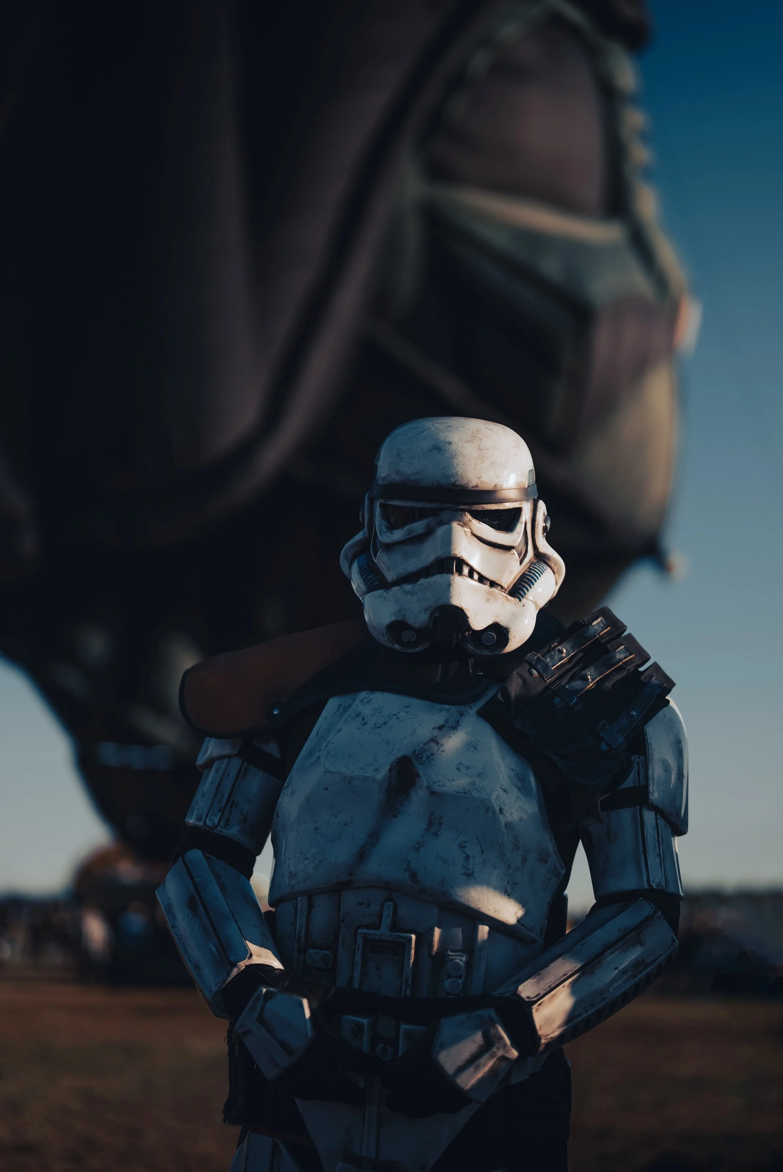 A person dressed as a Star Wars stormtrooper holding a model of a TIE fighter top with a clear sky in the background.