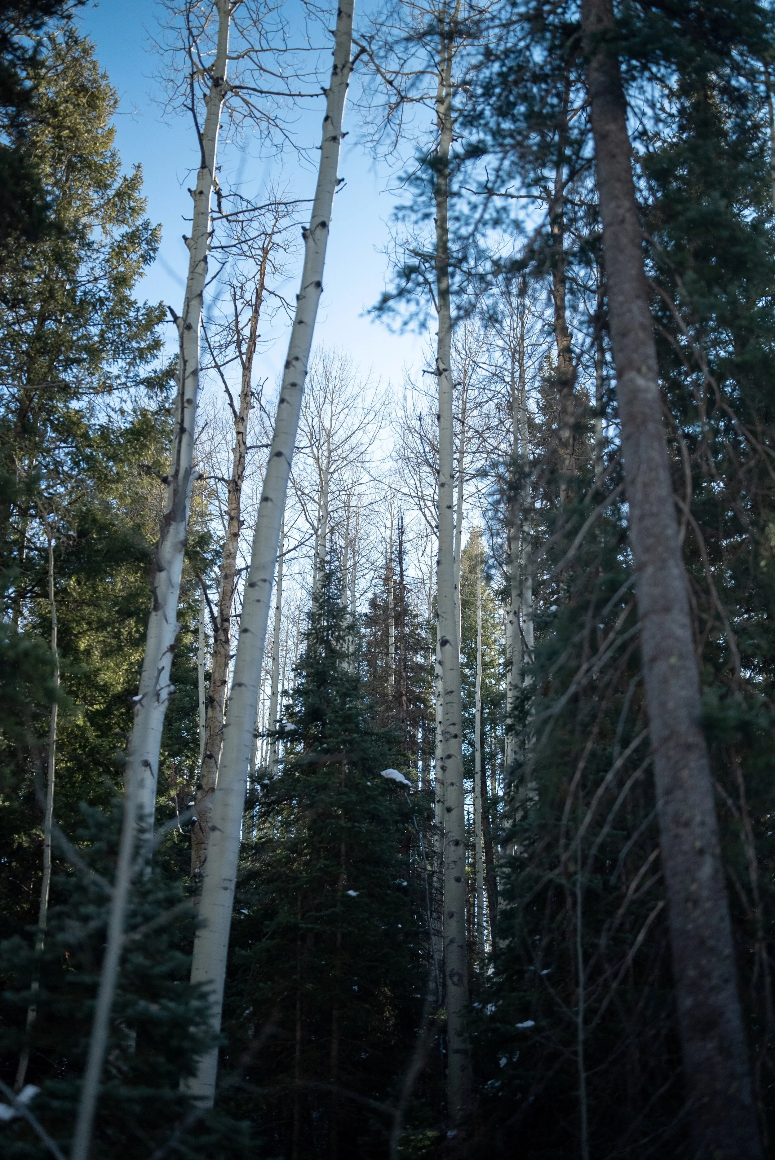 Tall trees, including aspens and evergreens, in a dense forest with a bright blue sky visible through the branches.