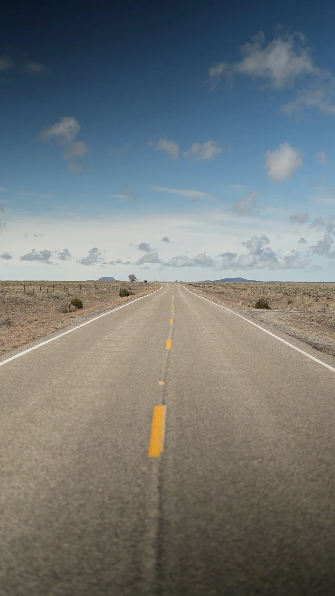Long empty desert road stretching into the horizon under a partly cloudy sky.
