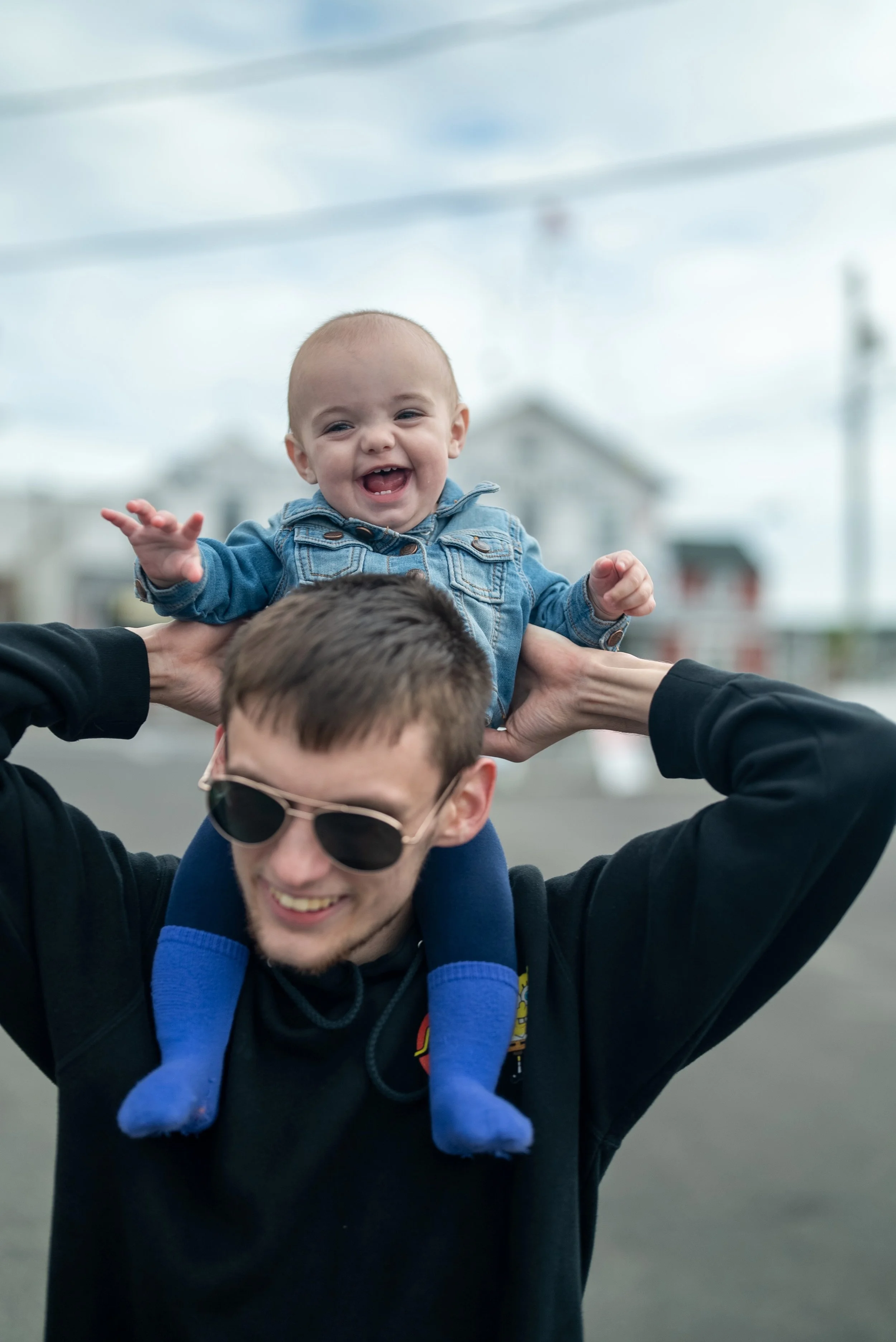 A man with sunglasses and a black hoodie carrying a smiling baby girl on his shoulders outdoors. The baby is wearing a denim jacket and blue socks, and appears happy and playful.