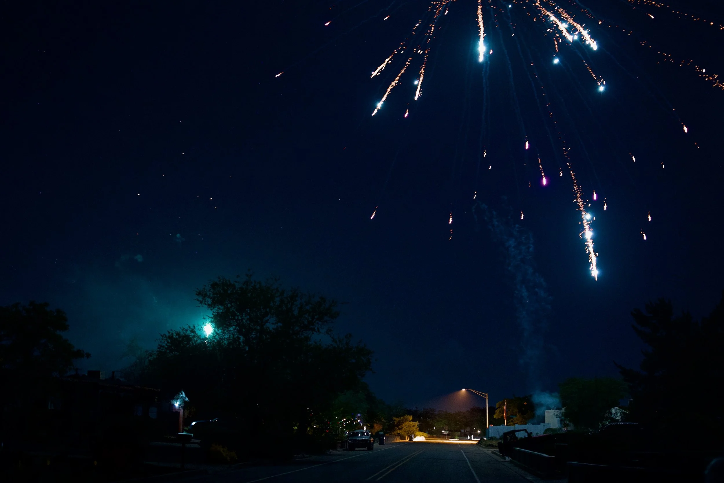 Night sky illuminated by fireworks with trees and a quiet street in the foreground.