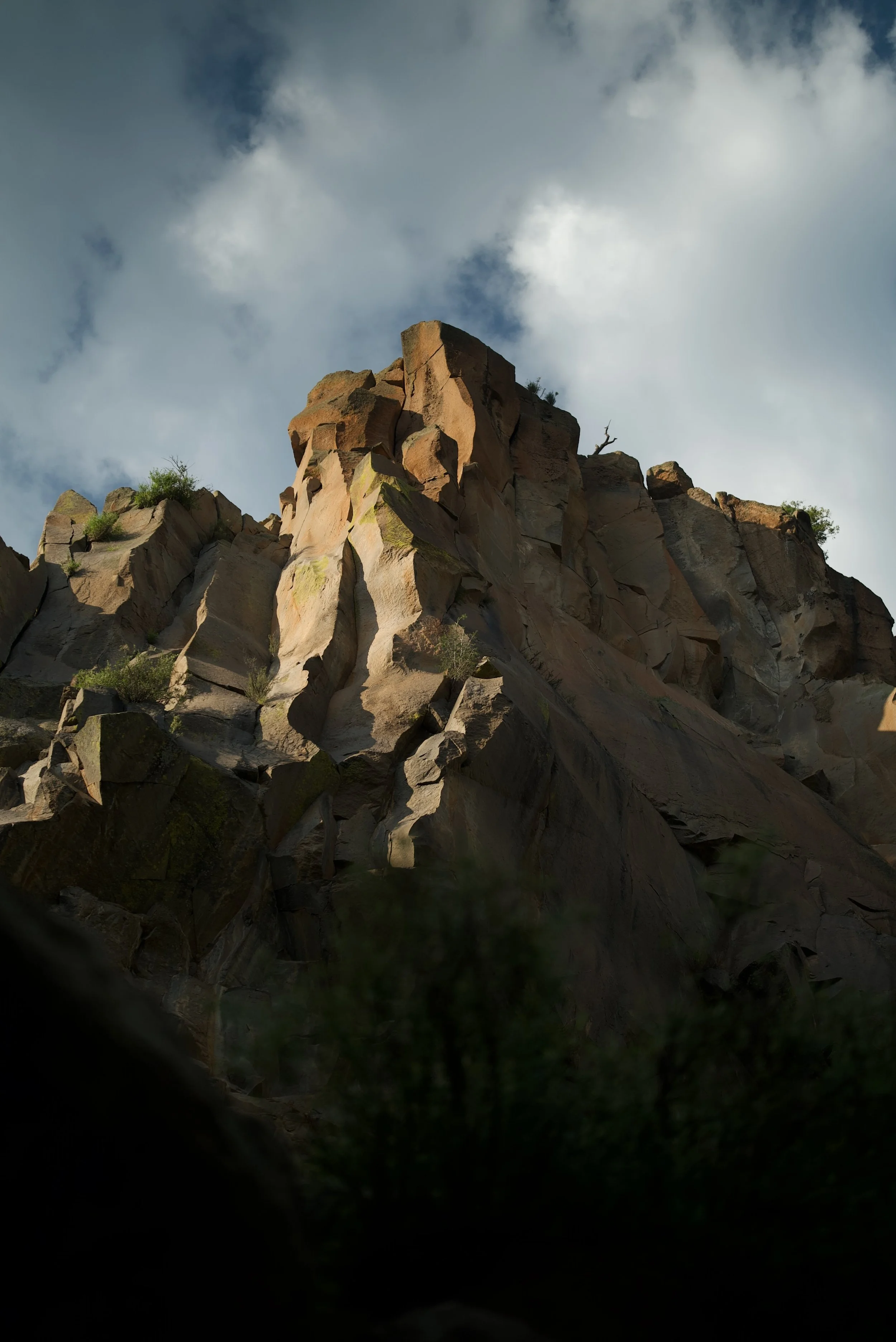 Photograph of a rugged, rocky mountain peak with sparse vegetation, set against a partly cloudy sky.