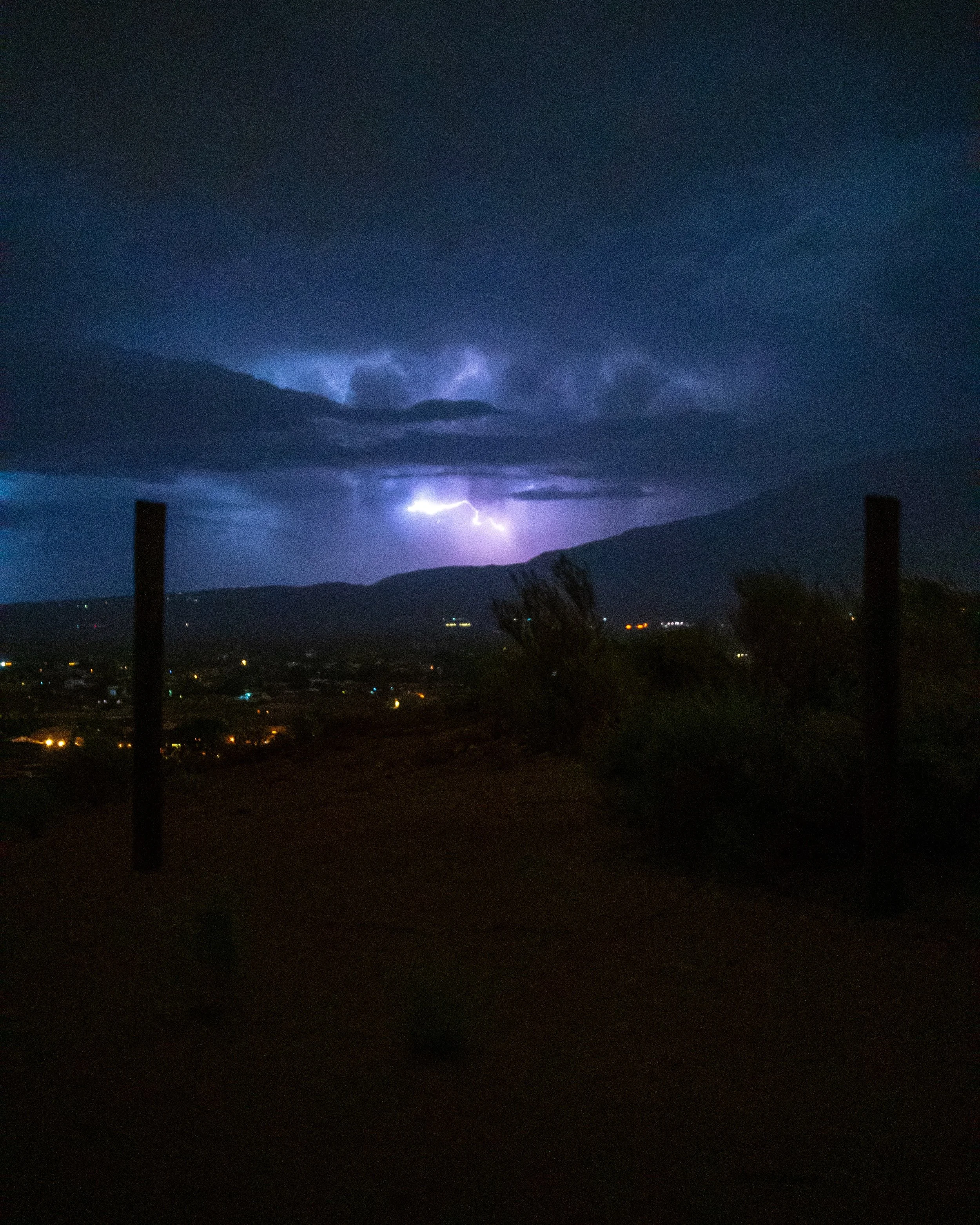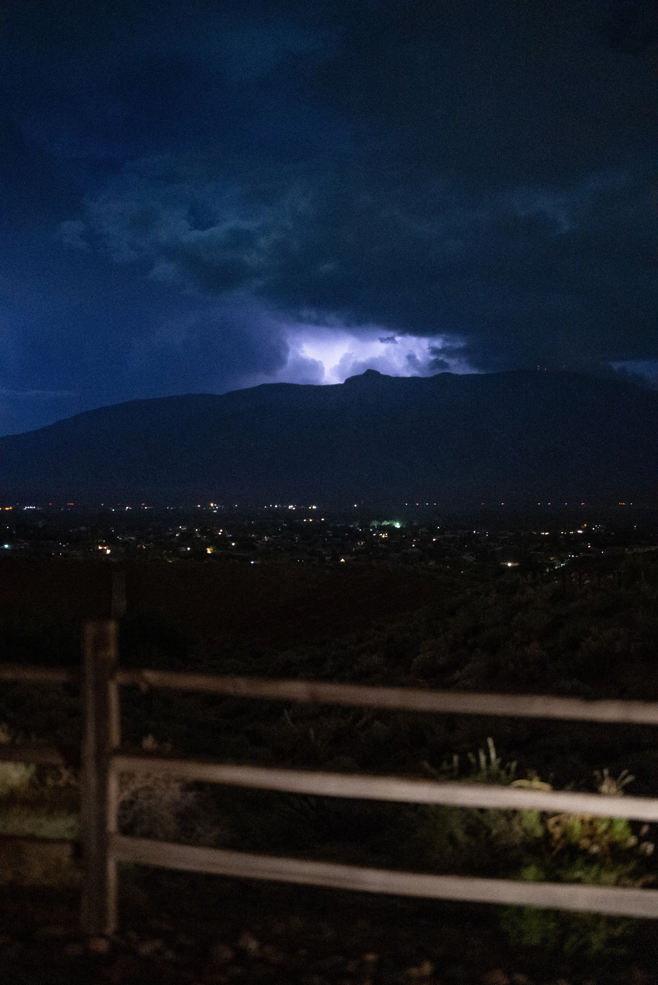 Nighttime view of a mountain with lightning illuminating the sky behind it, city lights in the distance, and a wooden fence in the foreground.
