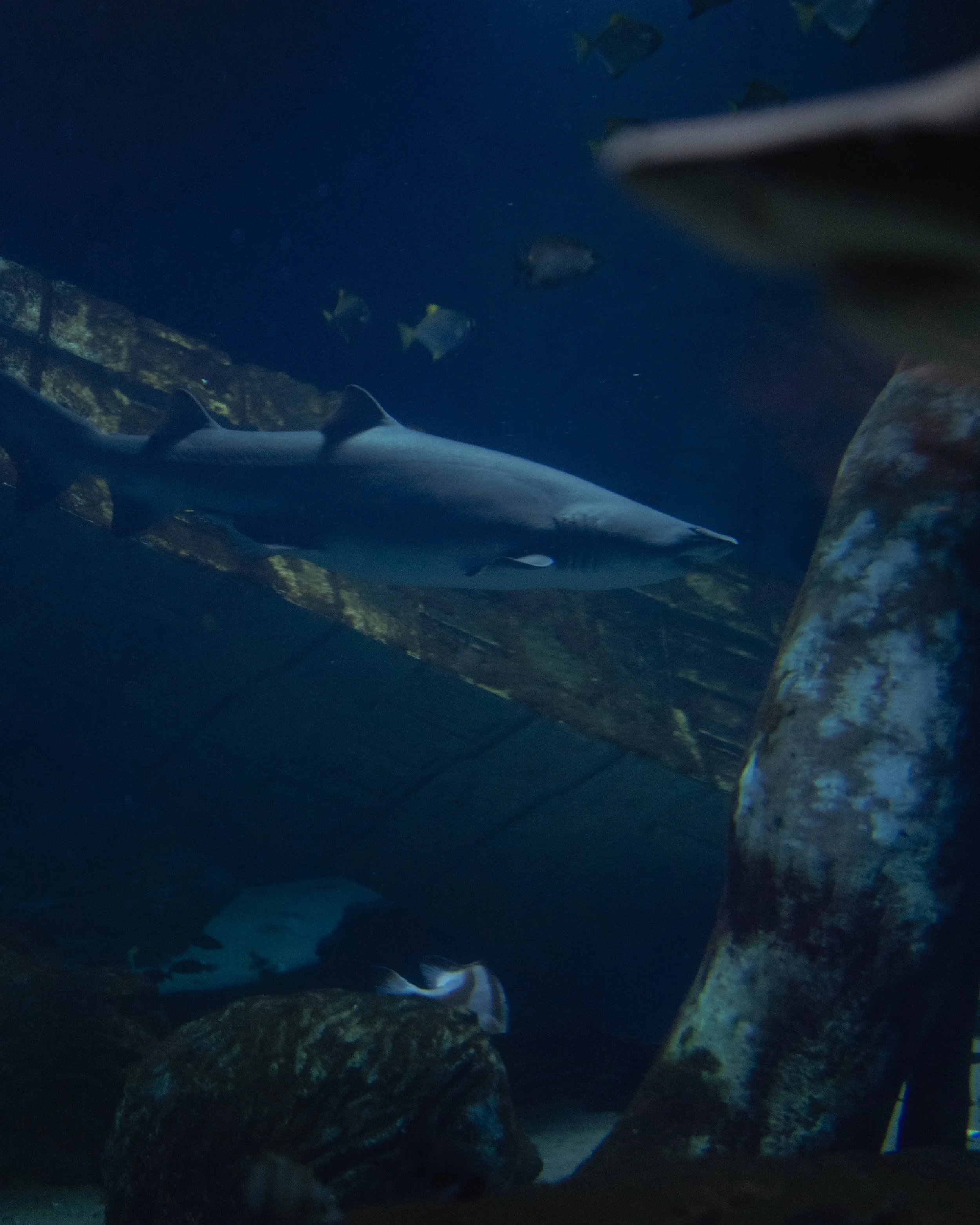 Underwater scene featuring a large shark swimming near rocks with smaller fish around.