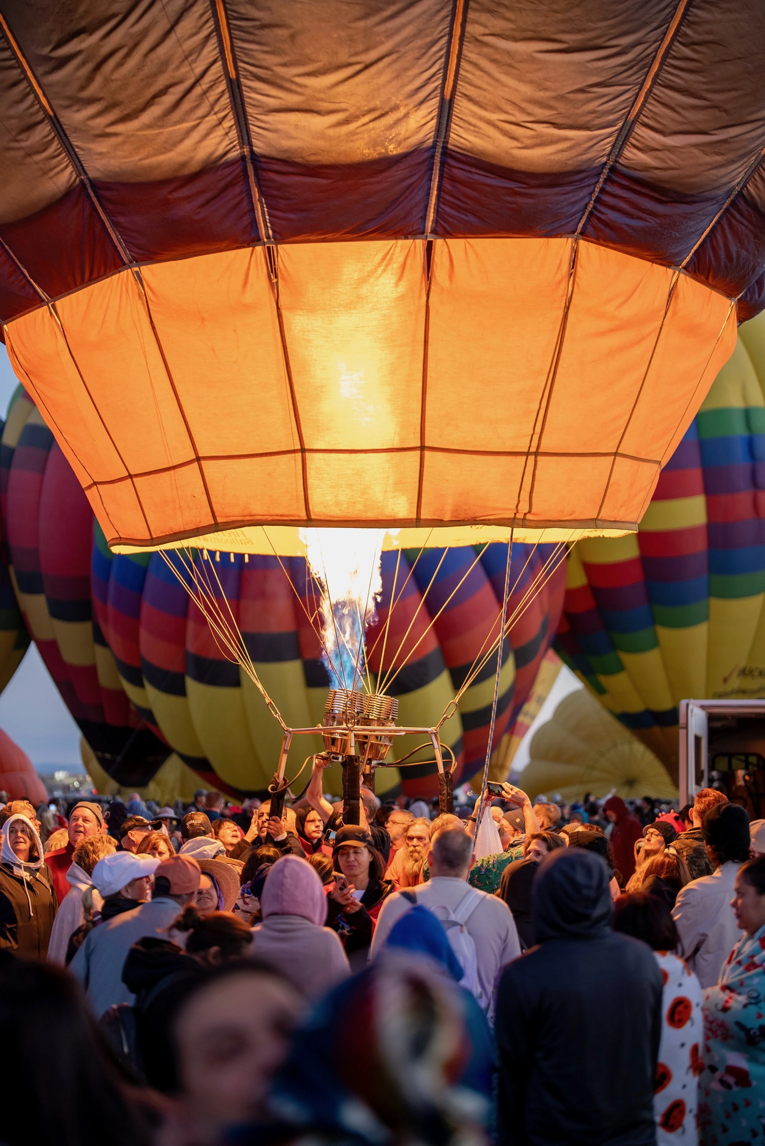 Crowd gathering at a hot air balloon festival with colorful balloons, with one balloon being inflated and lit, creating a bright glow and flame.