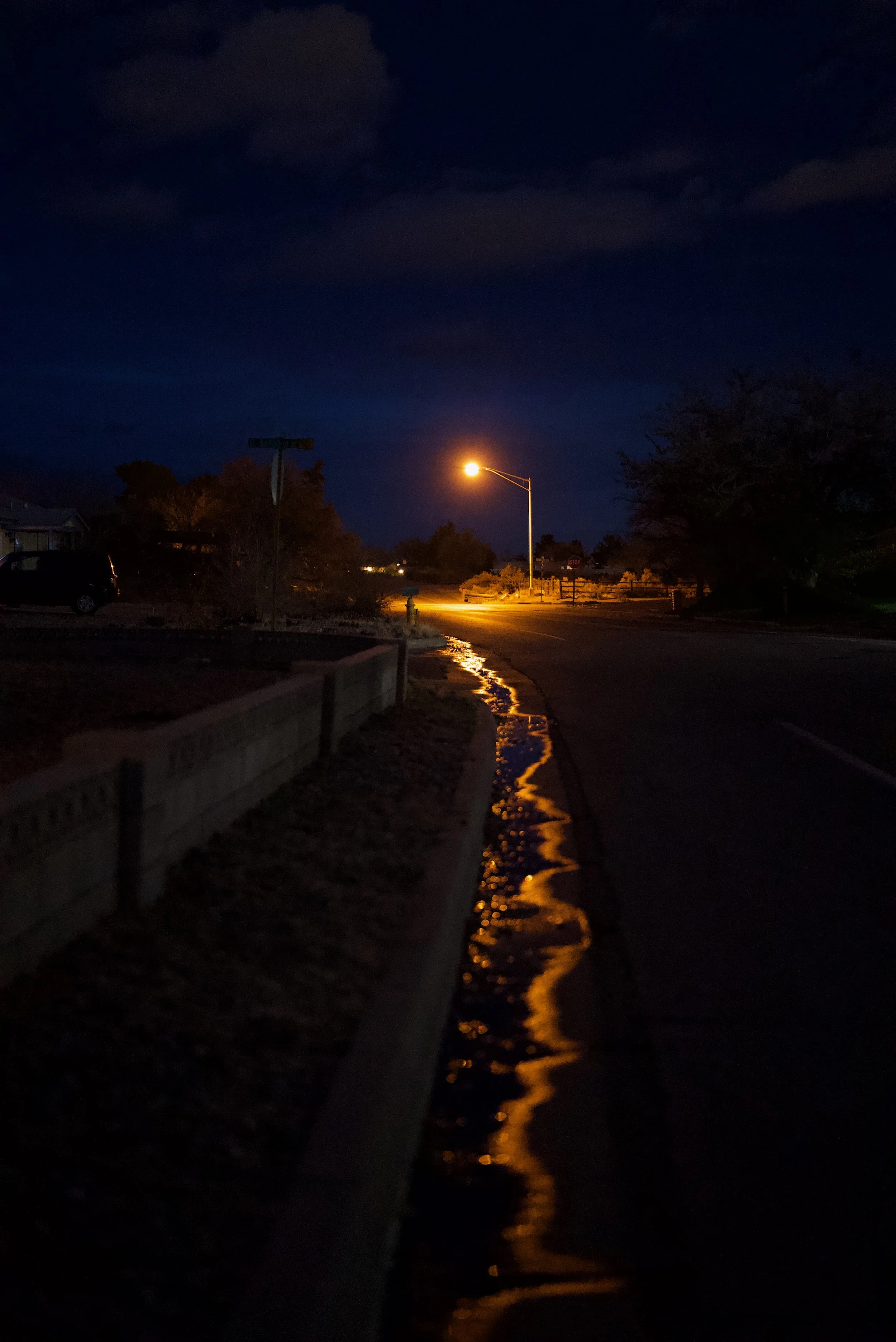A dark street scene at night with a streetlamp casting yellow glow, reflecting off a small puddle of water along the curb. The sky is dark with some clouds, and trees and houses are faintly visible in the background.
