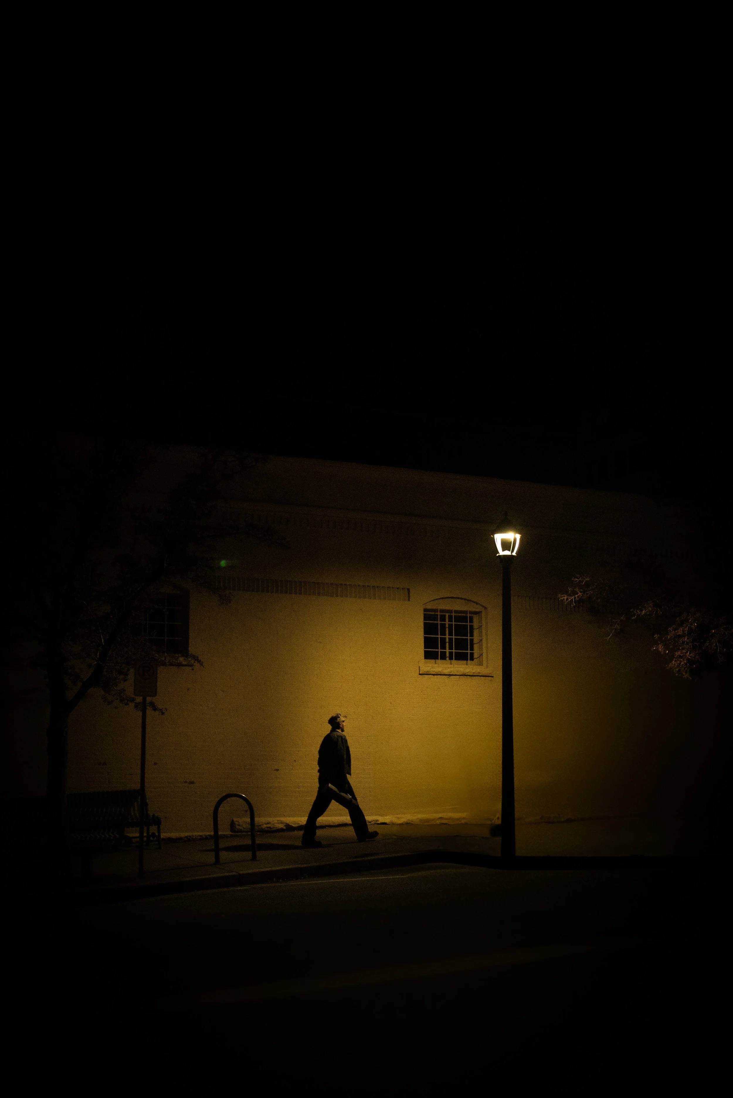 A person walking on a city sidewalk at night, illuminated by a streetlamp, with a brick building in the background.