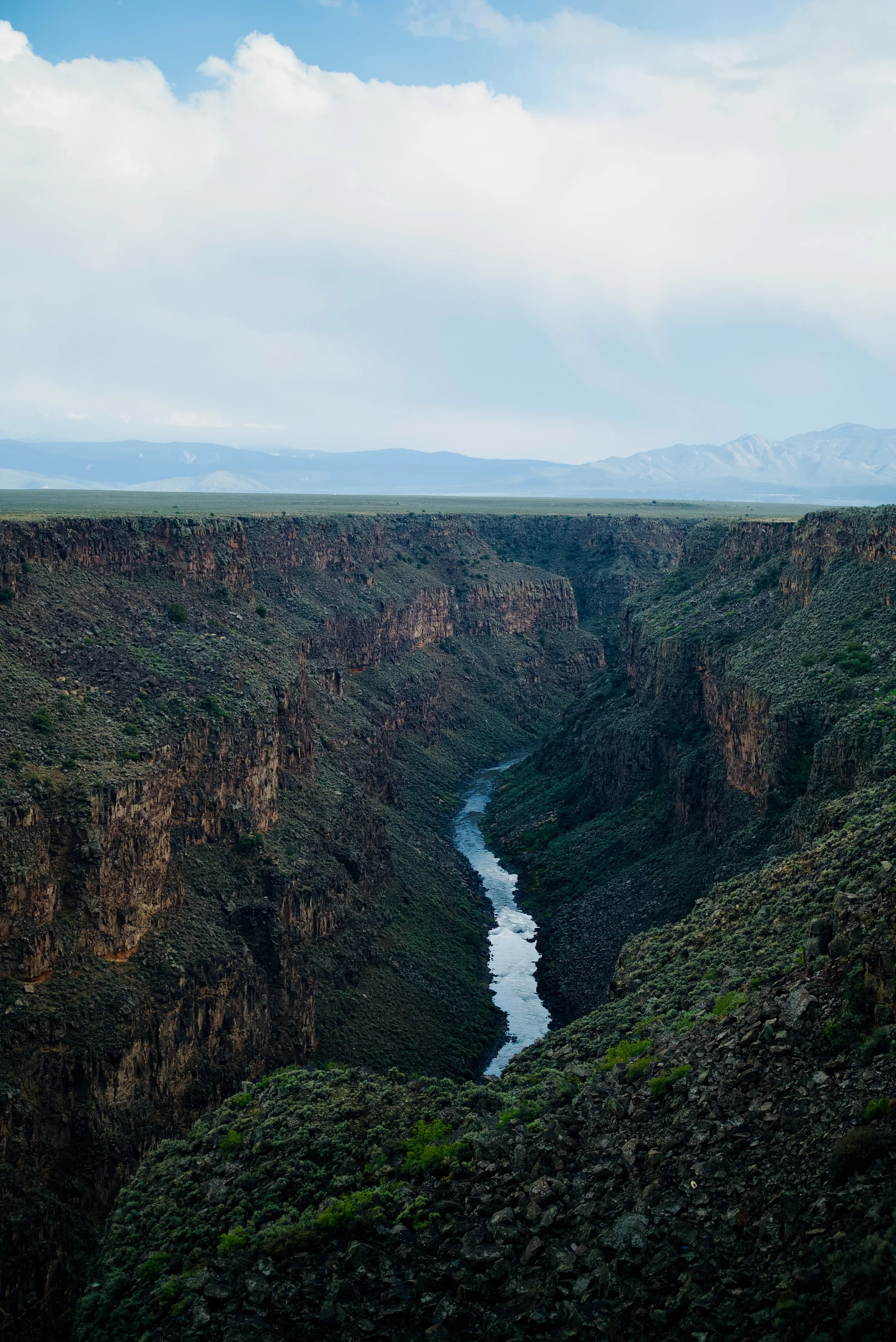 A deep canyon with a narrow river flowing through it, surrounded by rugged terrain and distant mountains under a partly cloudy sky.