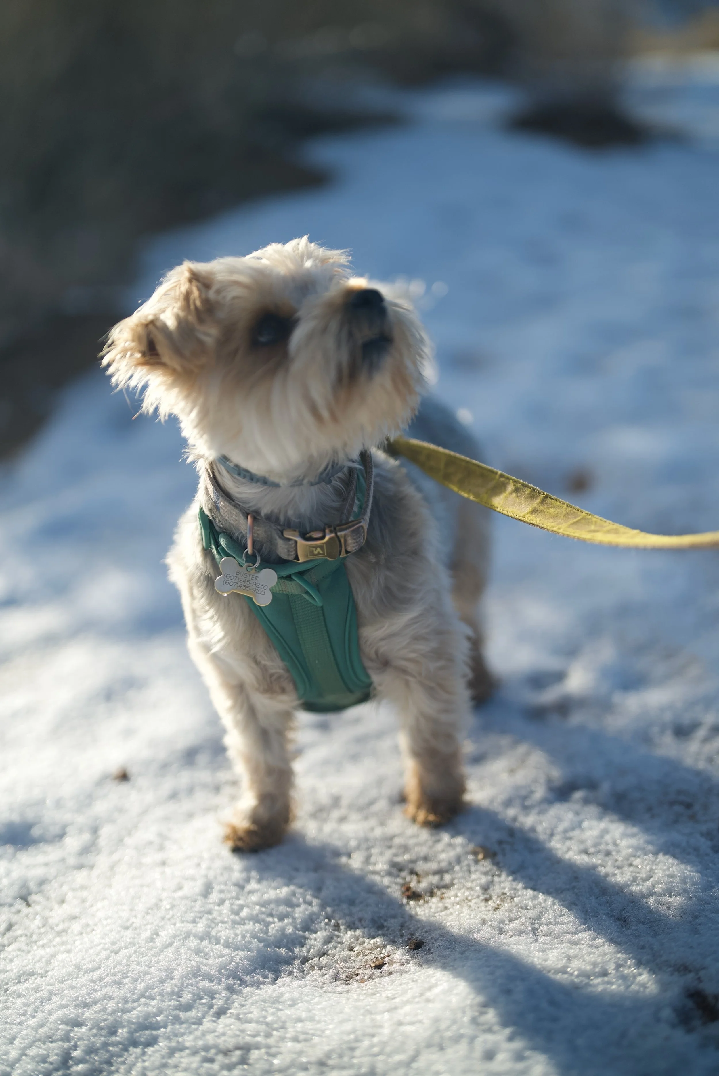 A small dog, possibly a Shih Tzu mix, stands on snow-covered ground with a harness and leash, looking upward with blurred background of snow and earth.