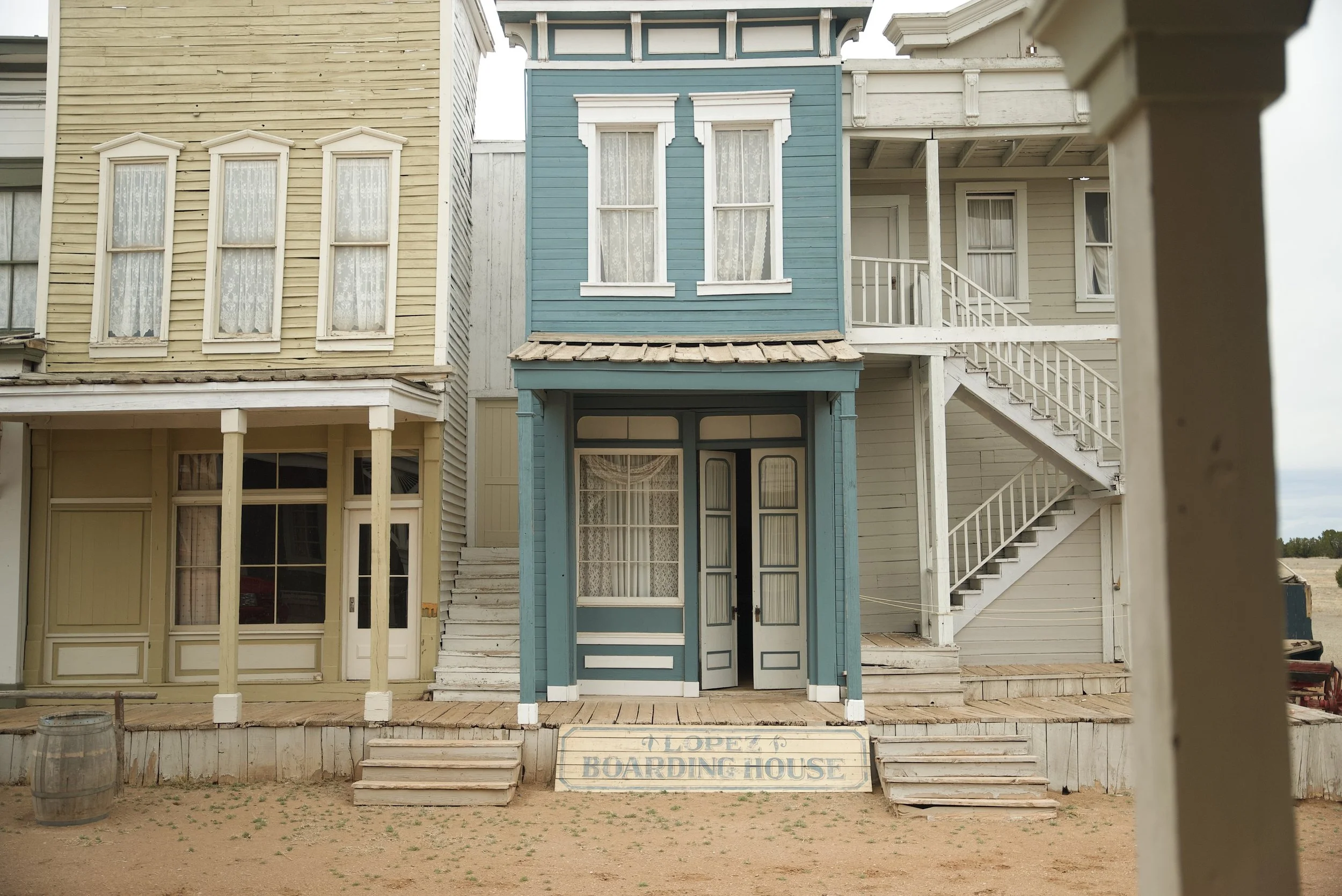 Front view of a two-story blue and white wooden building labeled 'Lopez Boarding House' with steps leading up to the entrance, surrounded by similar buildings, on a sandy ground.