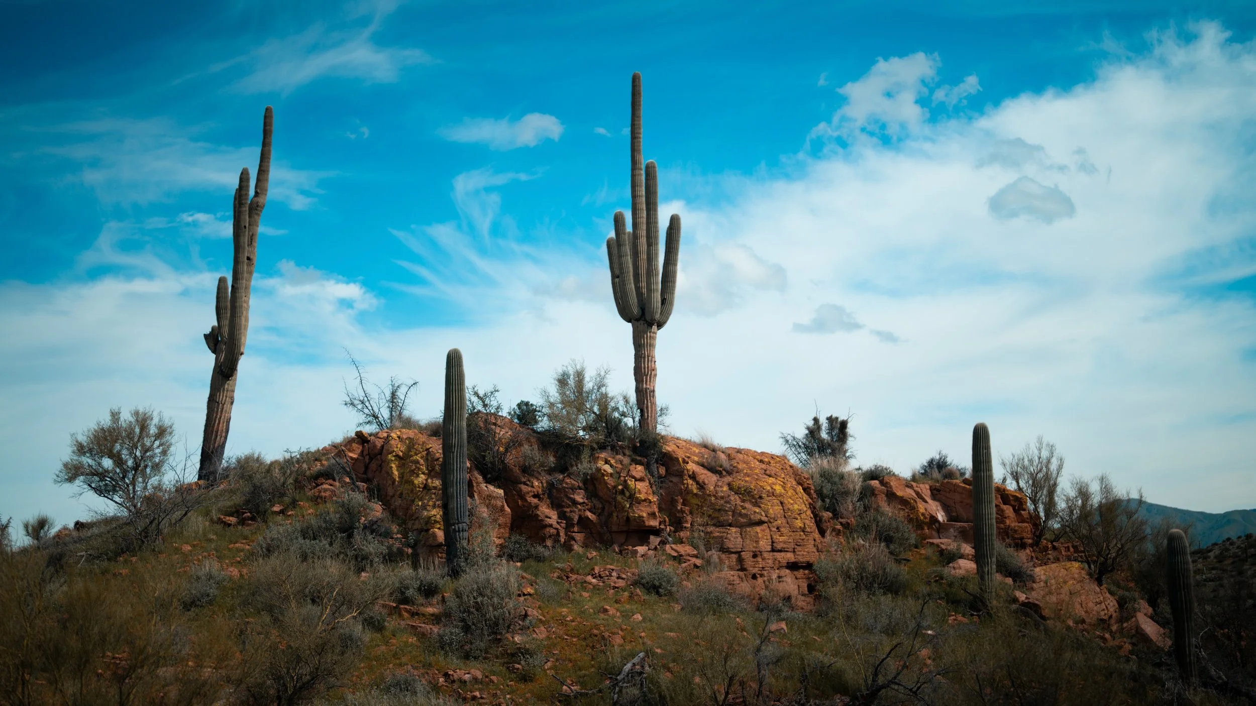 Desert landscape with tall saguaro cacti on a rocky hill under a blue sky with scattered clouds.