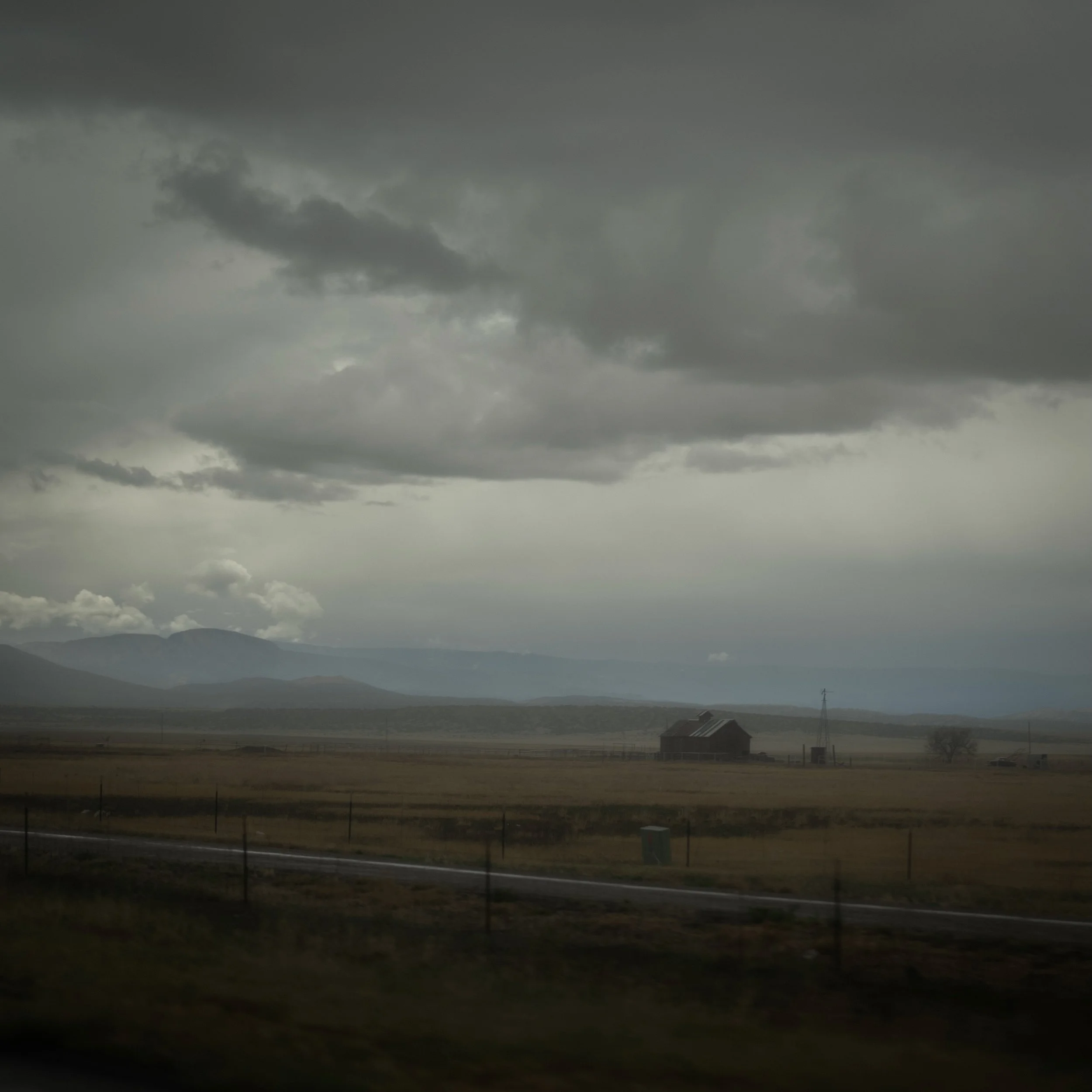A rural landscape with overcast sky, distant mountains, and a barn in an open field.
