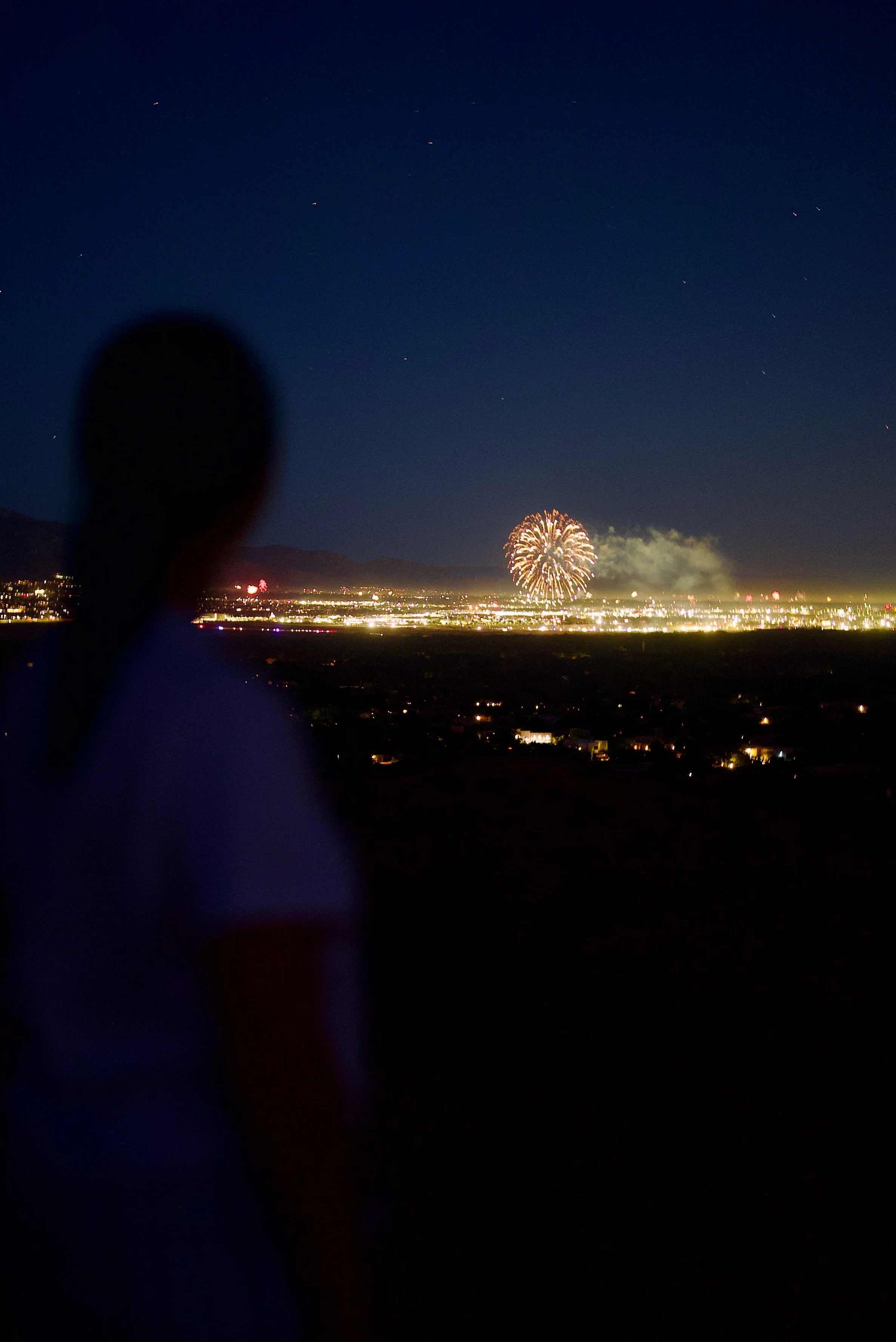 Person standing in the dark, watching fireworks over a city at night with a dark sky and stars.