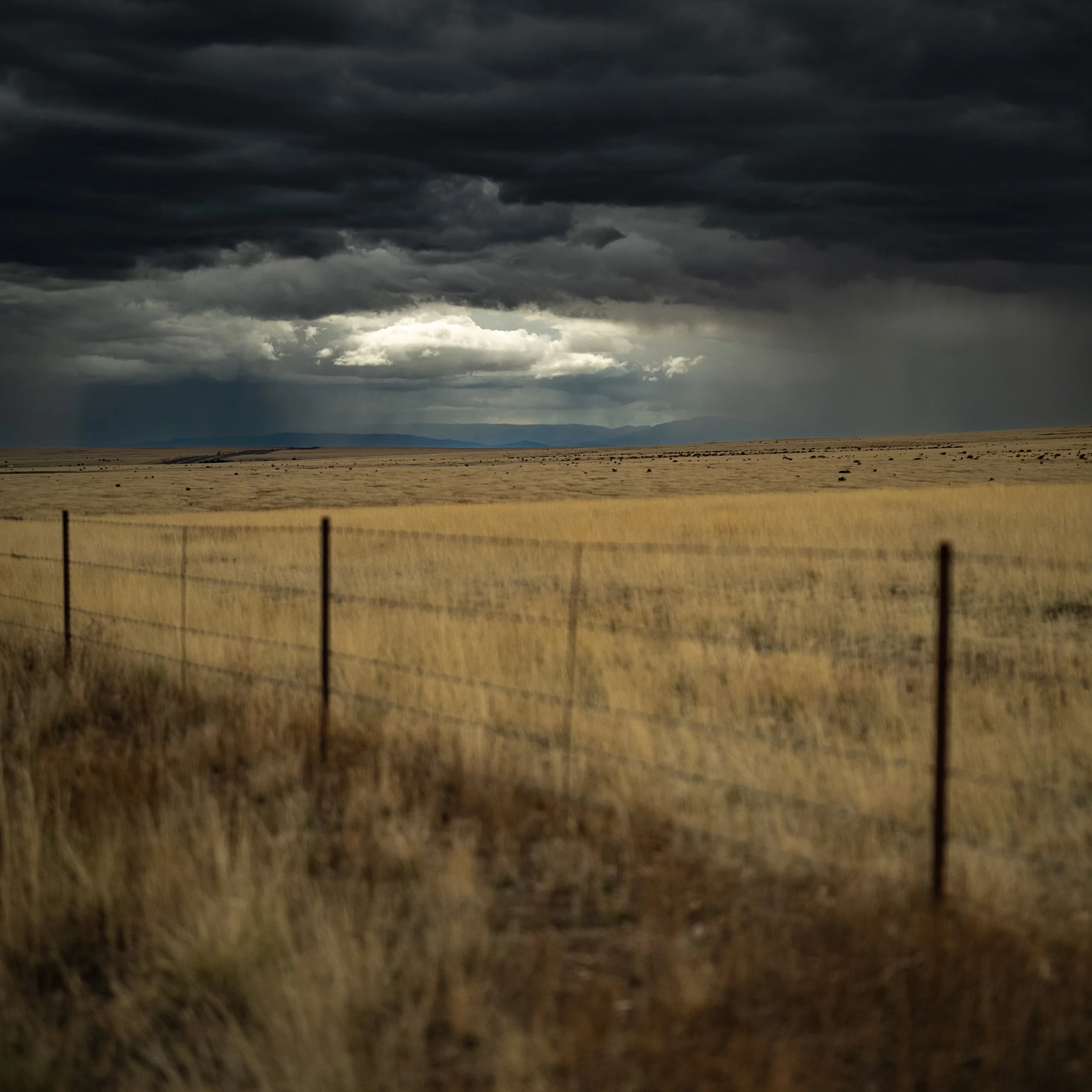 Open field with a wire fence under a dark, stormy sky with heavy clouds.