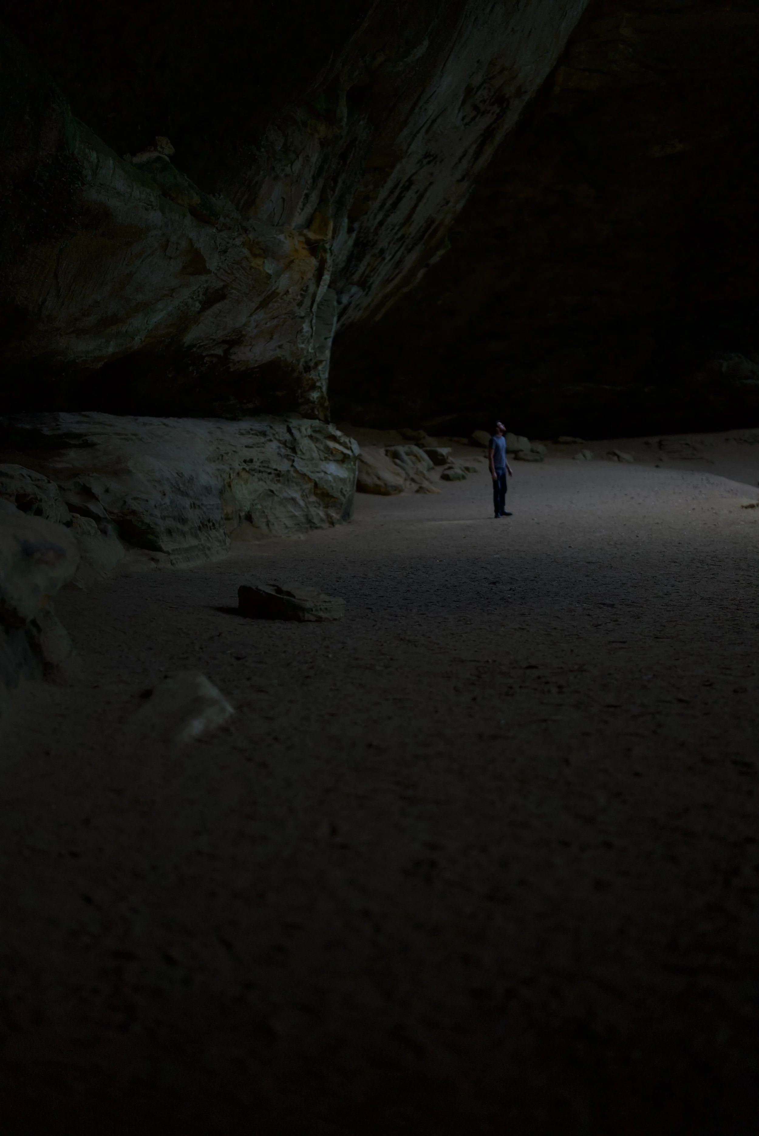 A person standing alone inside a large, dark cave with rugged rock walls and a sandy floor.
