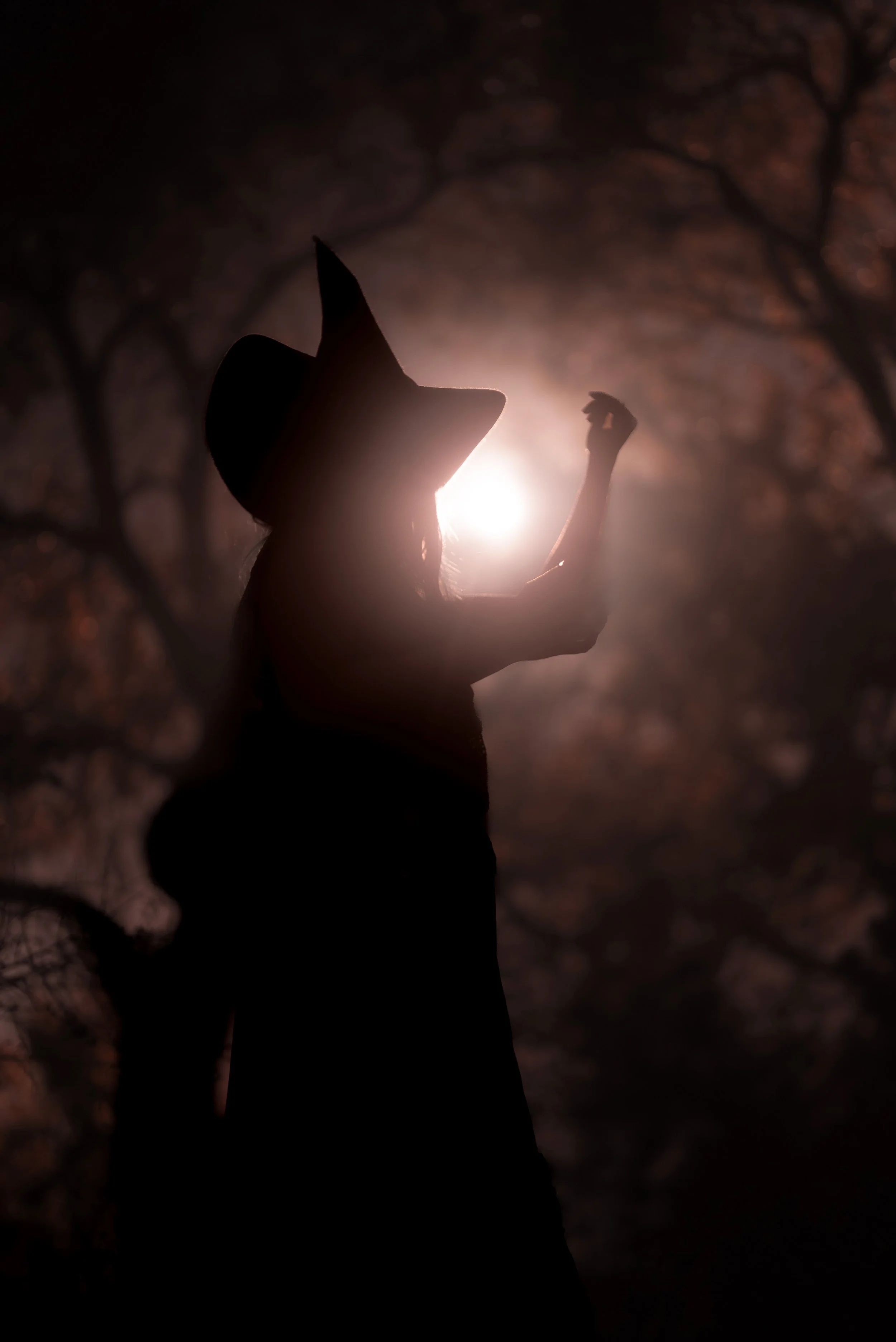 Silhouette of a person wearing a witch hat, standing outdoors at night with the bright moon behind them and trees in the background.