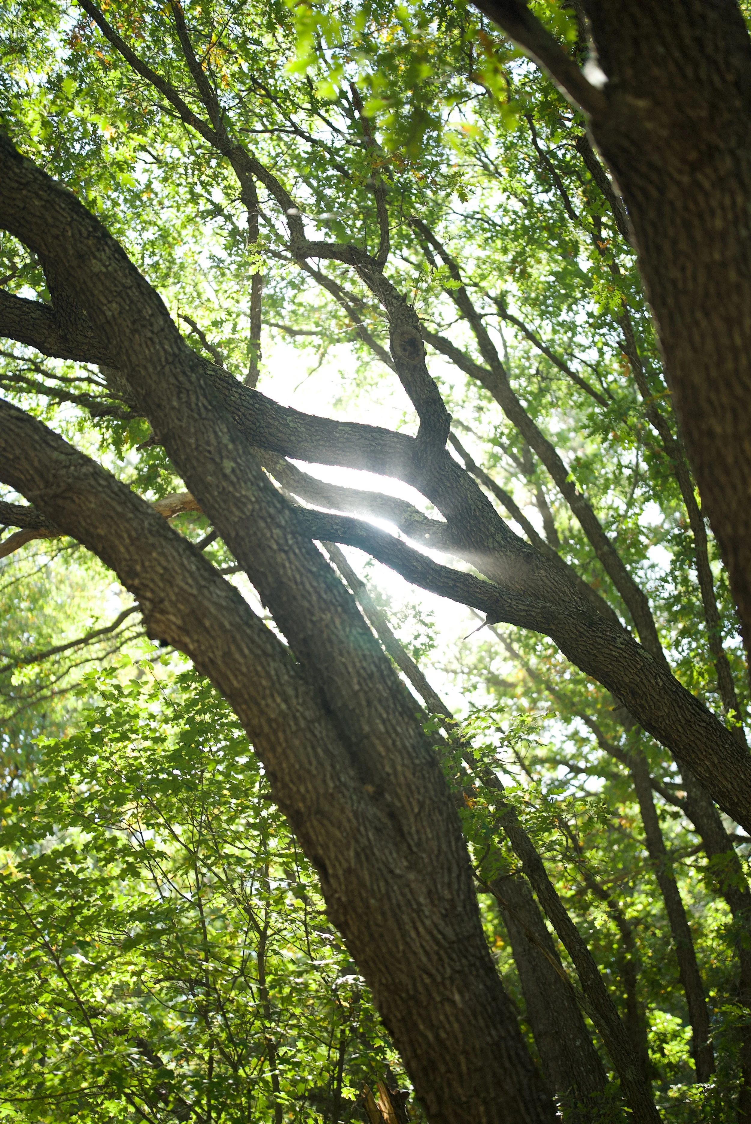 Sunlight shining through the green leafy branches of tall trees in a forest.