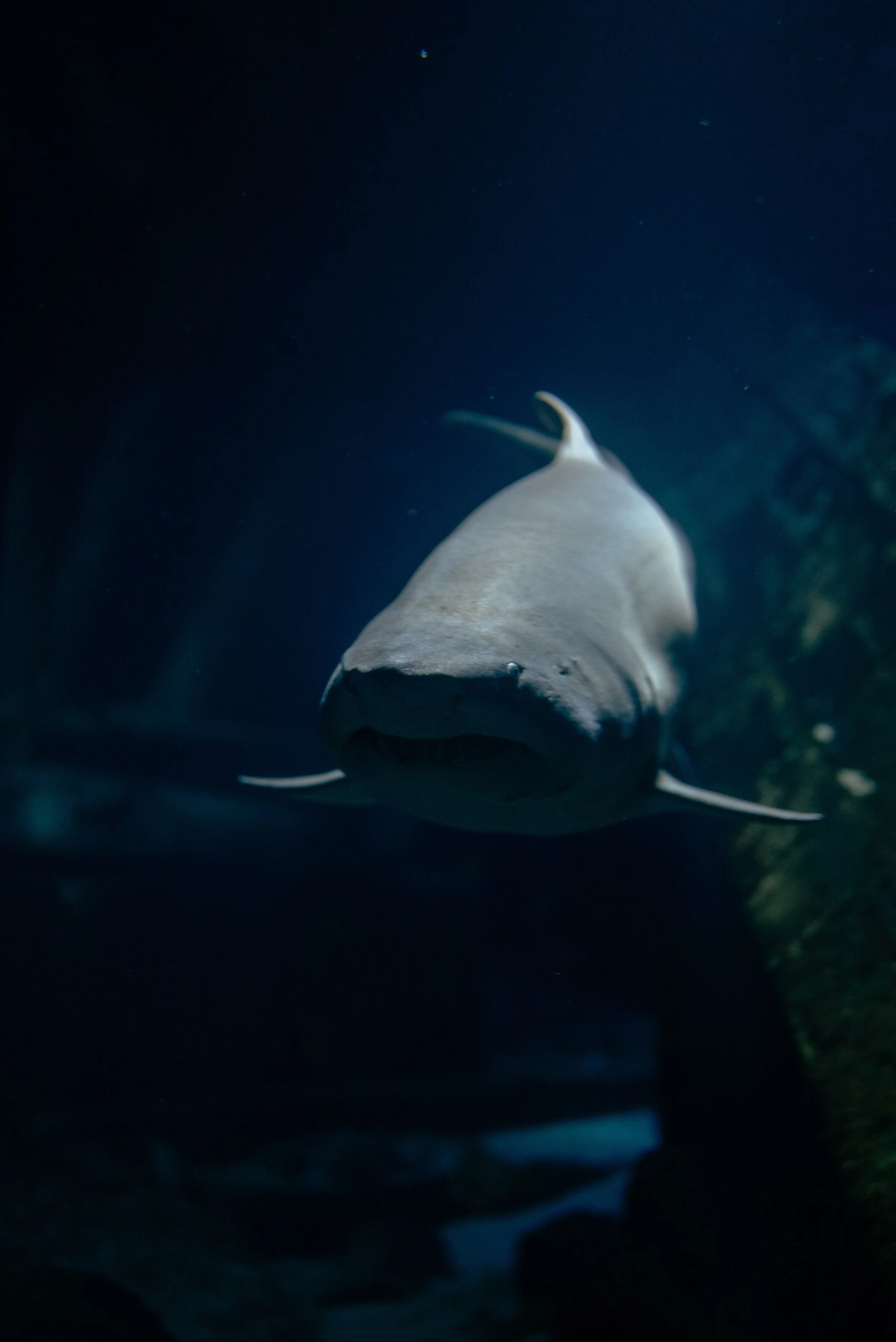 Underwater view of a shark swimming towards the camera in a dark ocean