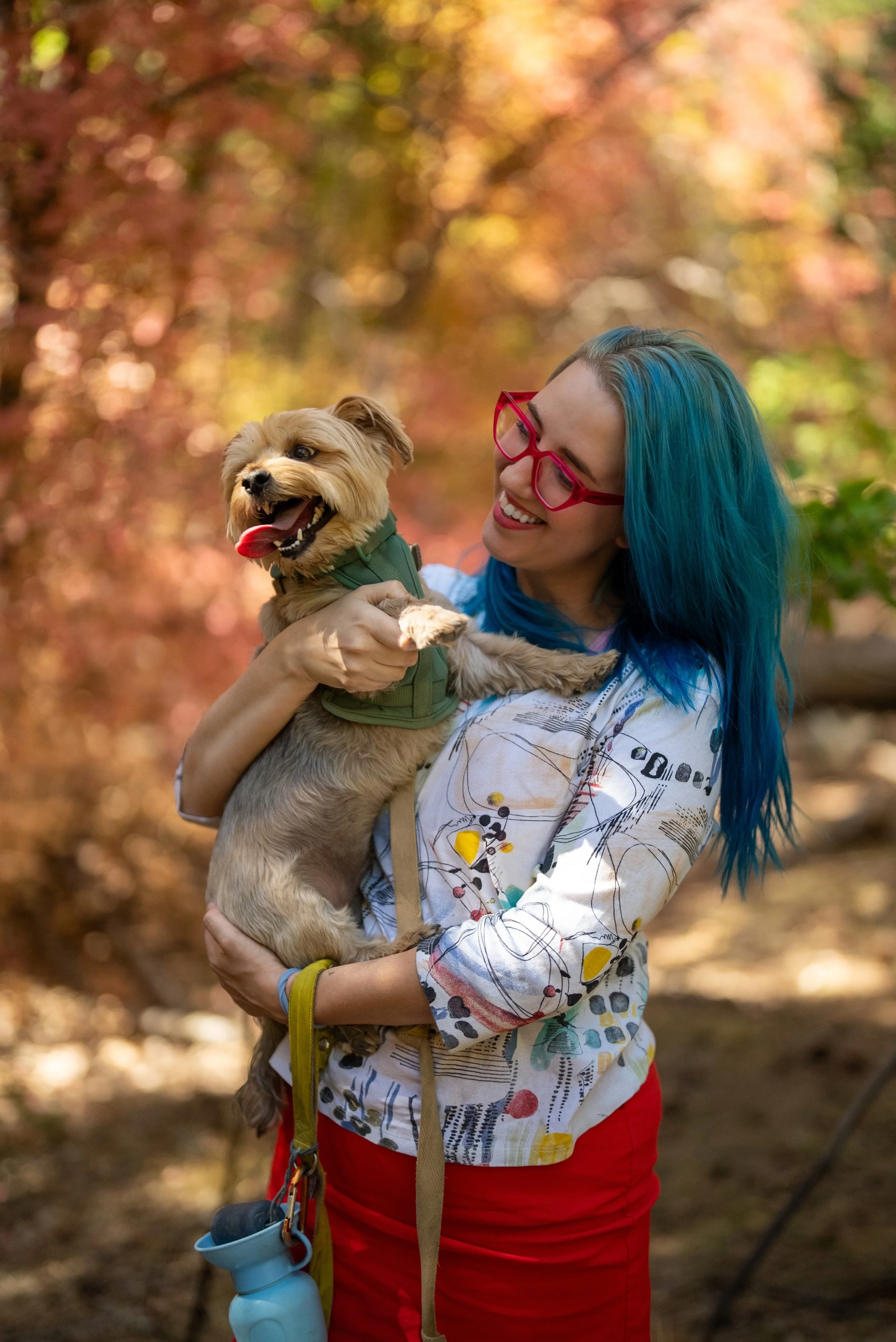 A woman with blue hair, wearing red glasses, smiles as she holds a small, happy dog outdoors in a park during autumn.